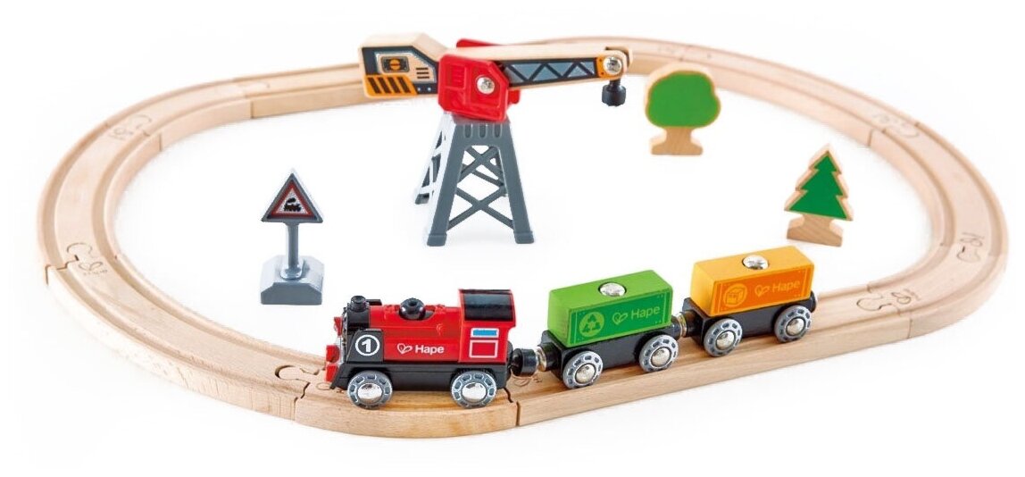Hape Деревянная Железная дорога Используйте магнитный кран для загрузки контейнеров в поезд. Затем нажмите кнопку на двигателе, чтобы объехать овальную дорожку и сделать доставки. Этот набор поможет вашему ребенку развить воображение и мелкую моторику рук. В наборе 1 поезд на батарейке с 2 вагончиками, кран, дорожный знак и деревья.