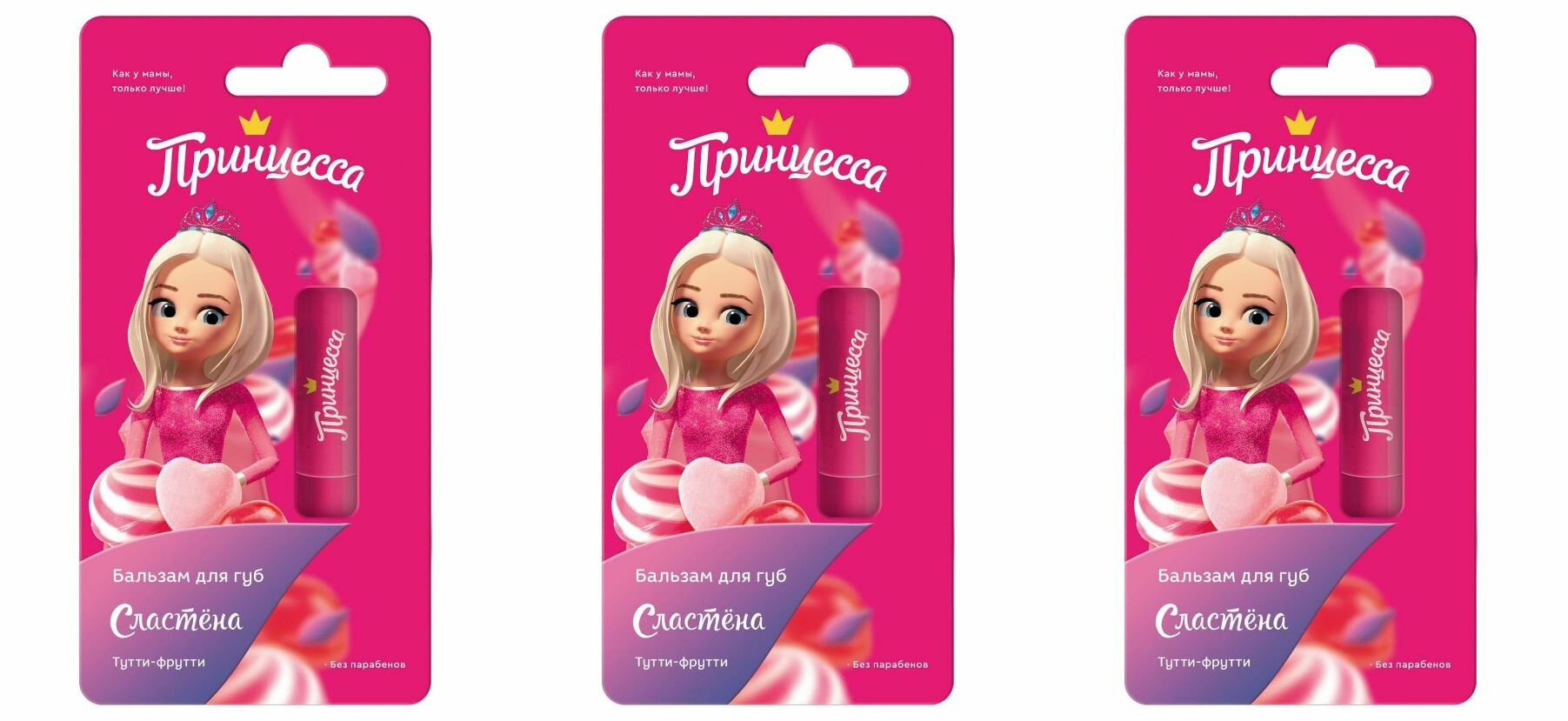 Принцесса предлагает самую вкусную защиту для самых нежных губ! Бальзамы серии Сластена, обладают не только нежным ароматом, но и нежным сладким вкусом. Комплекс из масла макадамии и натуральных экстрактов малины и шелковицы обеспечивает полноценный уход за нежной кожей губ, защищает и увлажняет ее. Бальзам Сластена не содержит парабенов, так как создан специально для маленьких красавиц. Теперь твои губки самые красивые и вкусные на свете!