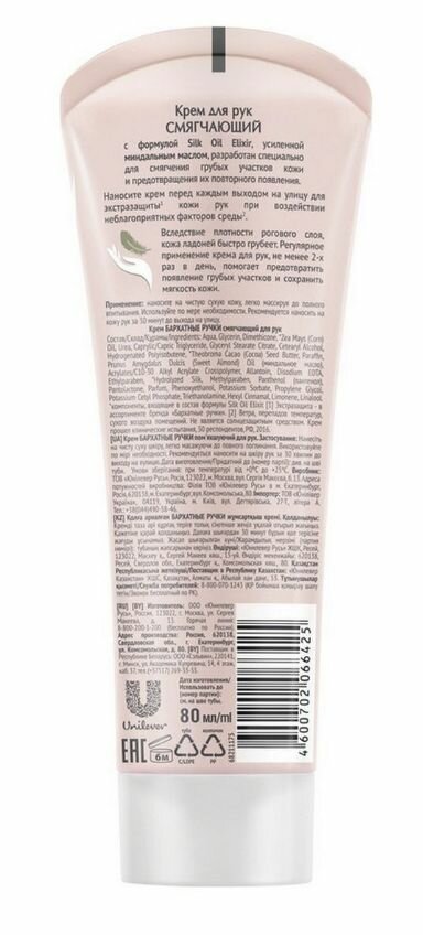 | Химический состав | Aqua, Glycerin, Dimethicone, Zea Mays (Corn) Oil, Urea, Caprylic/Capric Triglyceride, Glyceryl Stearate Citrate, Cetearyl Alcohol, Hydrogenated Polyisobutene, Theobroma Cacao (Cocoa) Seed Butter, Paraffin, Acrylates/C10-30 Alkyl Acrylate Crosspolymer, Allantoin, Disodium EDTA, Ethylparaben, Hydrolyzed Silk, Methylparaben, Olea Europaea (Olive) Fruit Oil, Panthenol, Pantolactone, Parfum, Phenoxyethanol, Potassium Sorbate, Propylene Glycol, Potassium Cetyl Phosphate, Triethanolamine, Hexyl Cinnamal, Limonene, Linalool. |