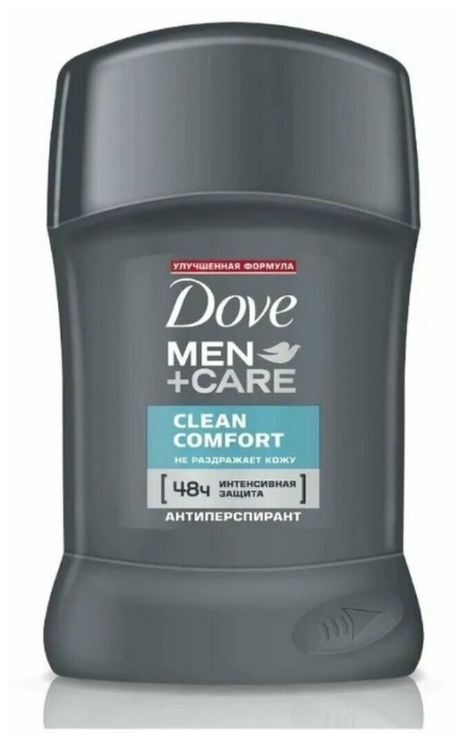 Антиперспирант Dove Экстразащита и уход обеспечивает защиту от пота и запаха на 48 часов, а также бережно ухаживает за деликатной кожей подмышек. Он на 1/4 состоит из увлажняющих компонентов, поэтому способствует защите кожи от раздражения. Продукция Dove не тестируется на животных. Бренд включён в белый список PETA - одной из самых больших в мире организаций по борьбе за права животных. Антиперспирант Dove MEN + CARE Clean Comfort не раздражает кожу, 48 ч интенсивная защита, 50 мл.