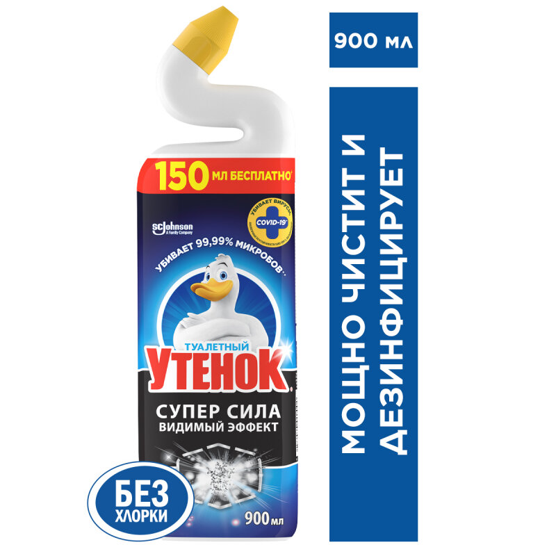 Супер эффективная формула Туалетный утенок «Супер сила. Видимый эффект» справляется с самыми сложными проблемами. Удаляет самые стойкие пятна, включая ржавчину, и до 100% известкового налета очищение даже под водой. Меняет цвет во время очищения.Вода, кислота соляная ? 5% ноНадавив на метки, открутите колпачок. Поднимите сидение унитаза. Нанесите средство под ободок унитаза по окружности. Для максимального результата: после нанесения средства используйте ершик для очистки поверхностей над и под водой. Для удаления загрязнений в нижней части унитаза налейте средство в воду и оставьте на 60 минут, смойте. Плотно закрутите колпачок. Используйте регулярно для поддержания чистоты и свежести в туалете. Дезинфицирующий эффект достигается при 30 минутной экспозиции в отношении исследованных микроорганизмов (E. Coli 1257, Staphylococcus aureus 906, Pseudomonas aeruginosa, Candida albicans). Опасно! При попадании на кожу и в глаза вызывает химические ожоги. Может вызывать коррозию металлов. Вредно для водных организмов с долгосрочными последствиями.Меры предосторожности: использовать только по назначению. Беречь от детей! Не смешивать с другими чистящими и отбеливающими средствами. Не вдыхать пары, не допускать попадания средства в глаза, на кожу и одежду. Использовать резиновые перчатки, средства защиты глаз/лица. После применения тщательно вымыть руки. При вдыхании: свежий воздух, покой. При попадании на кожу (или волосы): немедленно снять всю загрязнённую одежду, кожу обильно промыть водой или под душем. При попадании в глаза: осторожно промыть глаза водой в течение нескольких минут. Снять контактные линзы, если Вы ими пользуетесь и если это легко сделать. Продолжить промывание глаз. При проглатывании: прополоскать рот. Не вызывать рвоту! Немедленно обратиться за медицинской помощью, показать маркировку продукта. Избегать попадания в окружающую среду.Хранить плотно закрытым, только в упаковке завода-изготовителя, в вертикальном положении, в недоступном для детей и посторонних месте, отдельно от пищевых продуктов, при температуре от -5 °C до +25 °C. По окончании срока годности остатки средства вылить в унитаз, пустую упаковку утилизировать как бытовые отходы.