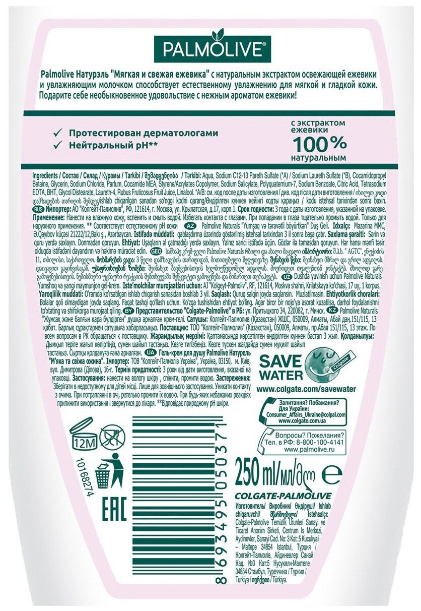 Подарите себе необыкновенное удовольствие с женским Гель - кремом для душа Palmolive Натурэль Мягкая и свежая Ежевика с увлажняющим молочком. Экстракт ежевики способствует естественному увлажнению кожи, а её приятный запоминающийся аромат, который невозможно спутать ни с чем другим, подарит прекрасное настроение на целый день.