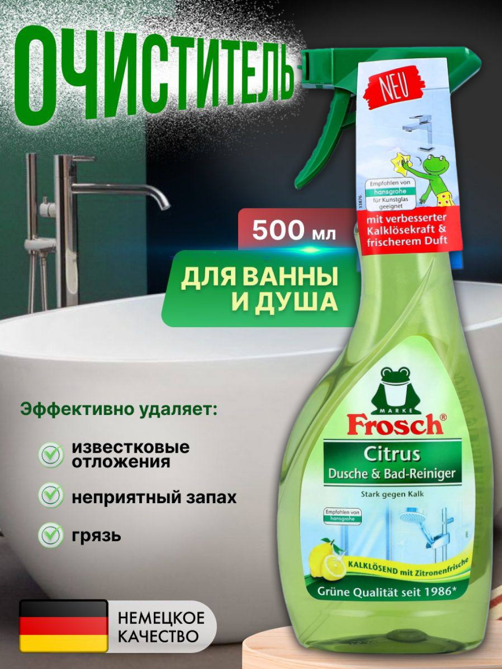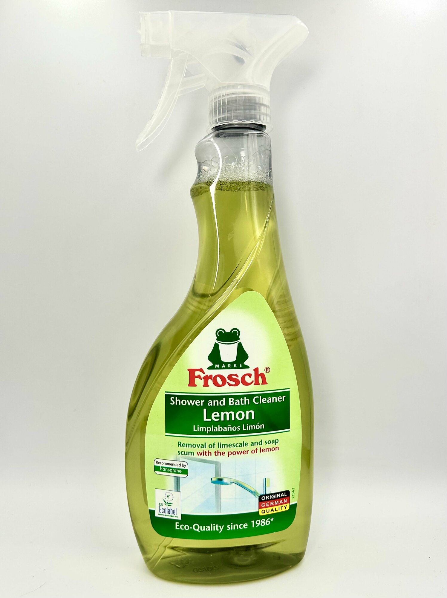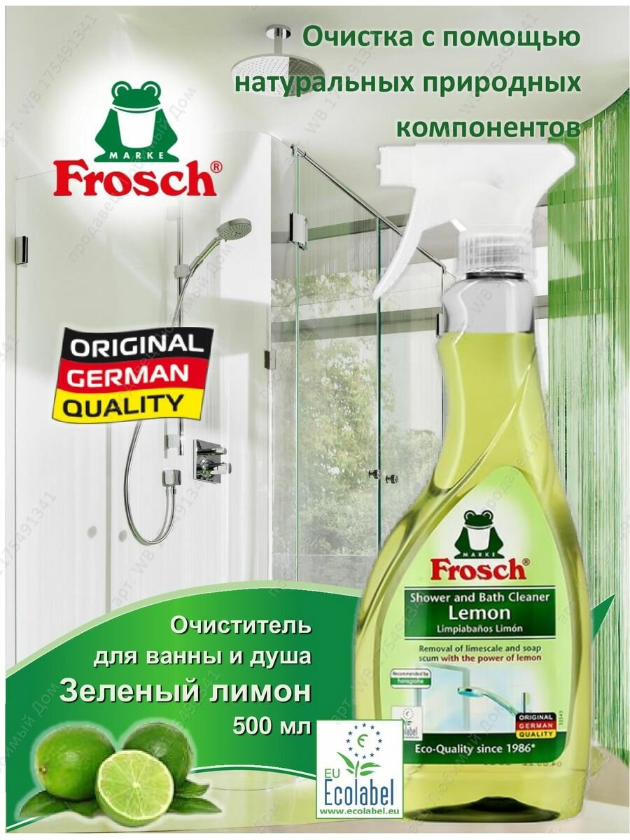 Очиститель для ванной и душа Зеленый Виноград Frosch эффективно очищает ванную комнату и душ от известкового налета, остатков мыла и грязи с помощью натуральной виноградной кислоты.