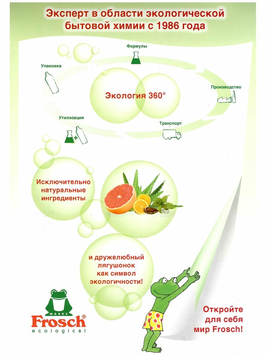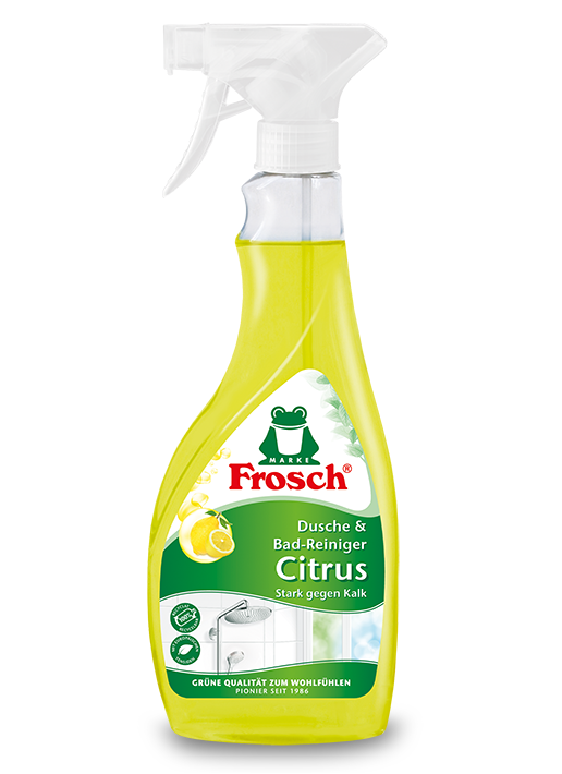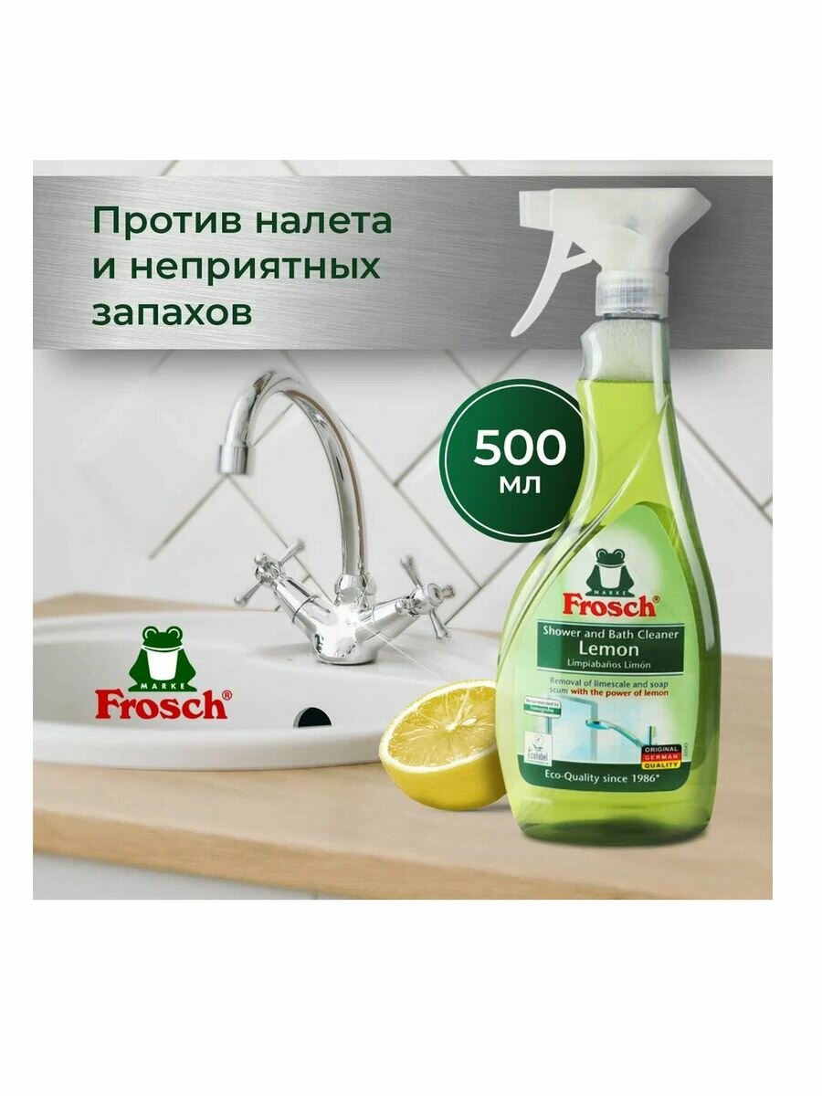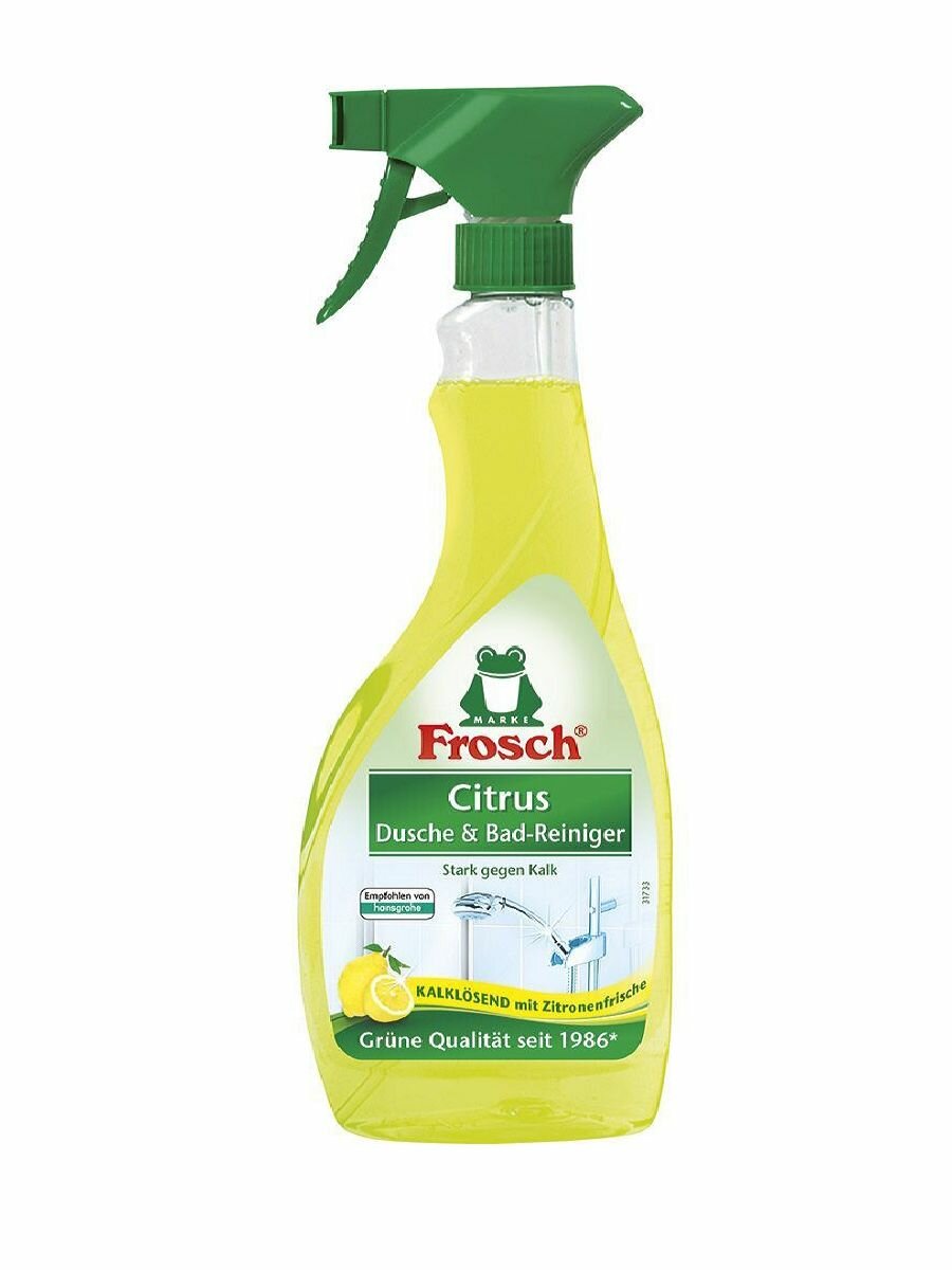 Очиститель для ванной и душа Зеленый Виноград Frosch эффективно очищает ванную комнату и душ от известкового налета, остатков мыла и грязи с помощью натуральной виноградной кислоты.