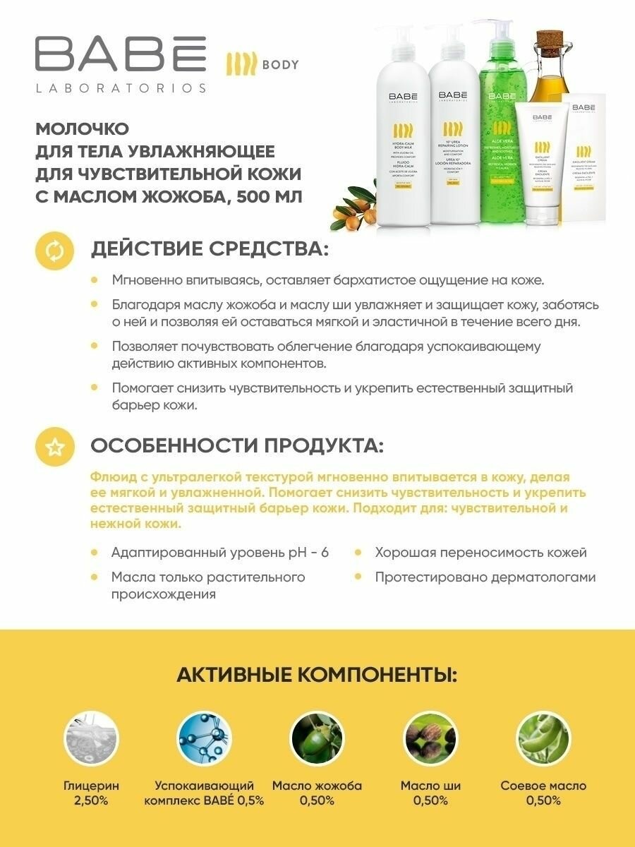 Жожоба и омега, входящие в состав BABE Laboratorios Увлажняющее для чувствительной кожи, усиливают природный защитный барьер кожи. Успокаивающий комплекс эффективно устраняет симптомы. Благодаря сверхтекучей текстуре оно моментально впитывается и обеспечивает круглосуточную защиту.