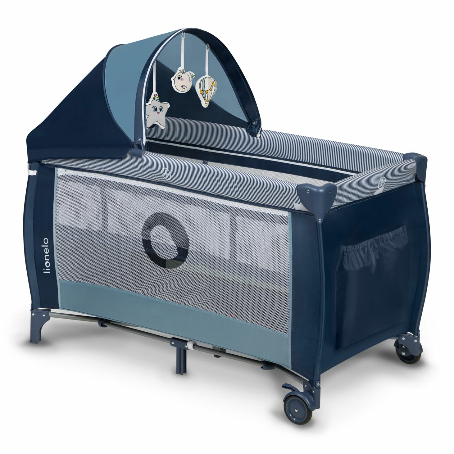 Манеж Lionelo Lo-Sven Plus вы создадите идеальные условия для своего отдыха и комфорта детей. Прочная конструкция, высокая функциональность и множество полезных дополнений. При этом вы всегда сможете взять её с собой. Особенности: Легко и быстро, компактно складывается/раскладывается Для детей с нуля и до 15 кг Три подвесных игрушки-мишки (съемные) Пеленальный столик Навесные корзинки для подгузников и прочего Затяжные ремни 2 уровня высоты матраcа Складной съёмный тент Электронная панель: помимо красочных огней и приятных мелодий, может давать лёгкую вибрацию, чтобы быстрее убаюкать малыша Колеса для более удобной транспортировки Легко переносить/перевозить. В комплекте: Мягкий матрасик размером 120 х 60 см Съемный подвесной столик для пеленания Капюшон с игрушками Электронный модуль с вибрацией, ночником и мелодиями Сумка для переноски Размеры: 125 x 65 x 77 см Материал: 100% полиэстер внимание! Дуги для укачивания в комплектацию НЕ входят! На все расцветки манежа нанесен новый логотип - капелька.