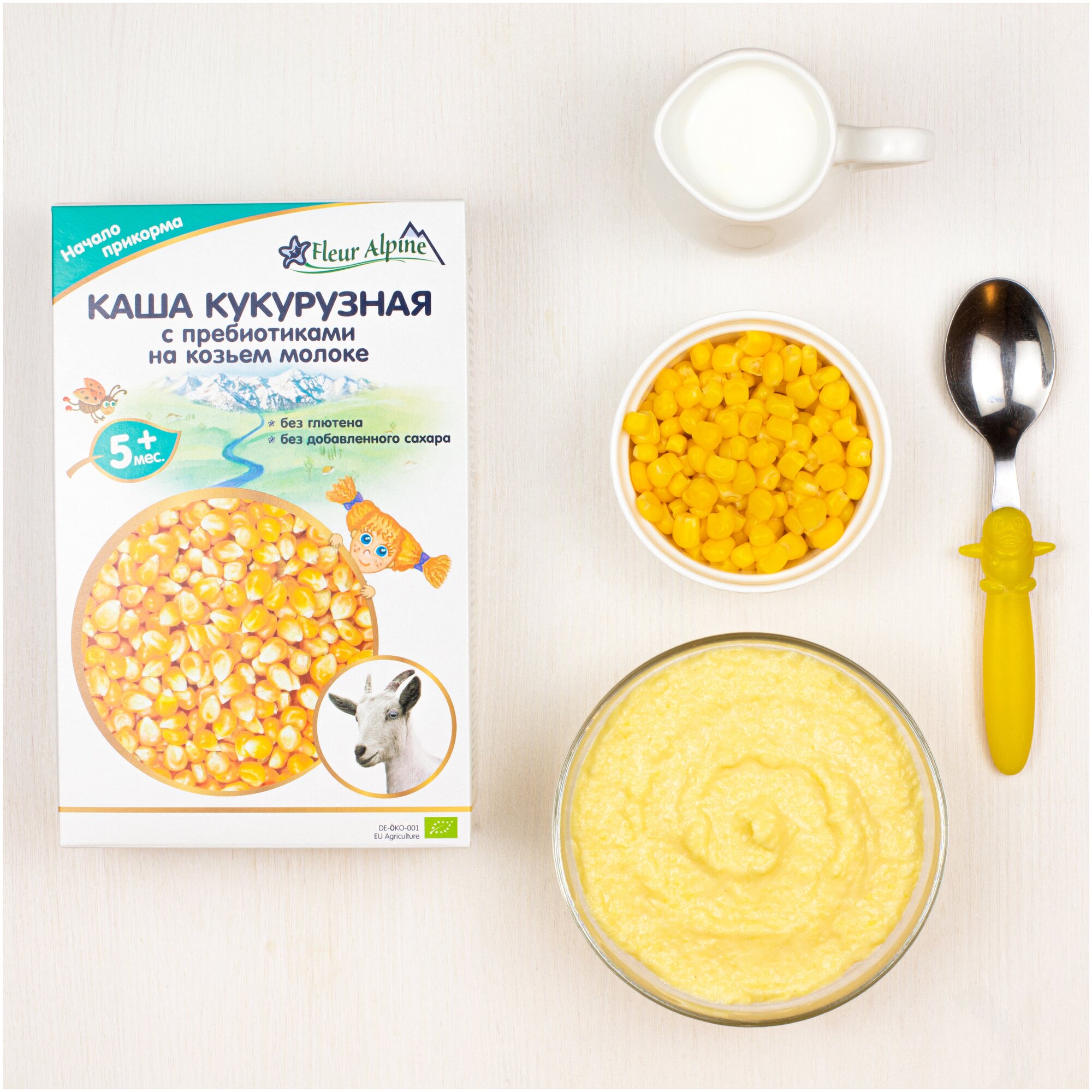 Состав: кукурузная мука, сухое цельное козье молоко, мальтодекстрин, фруктоолигосахариды (пребиотики)