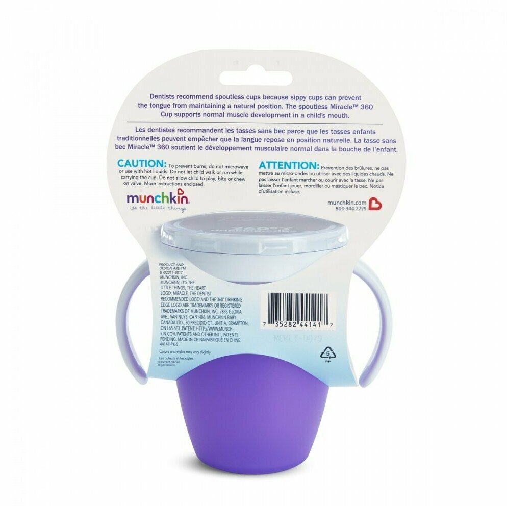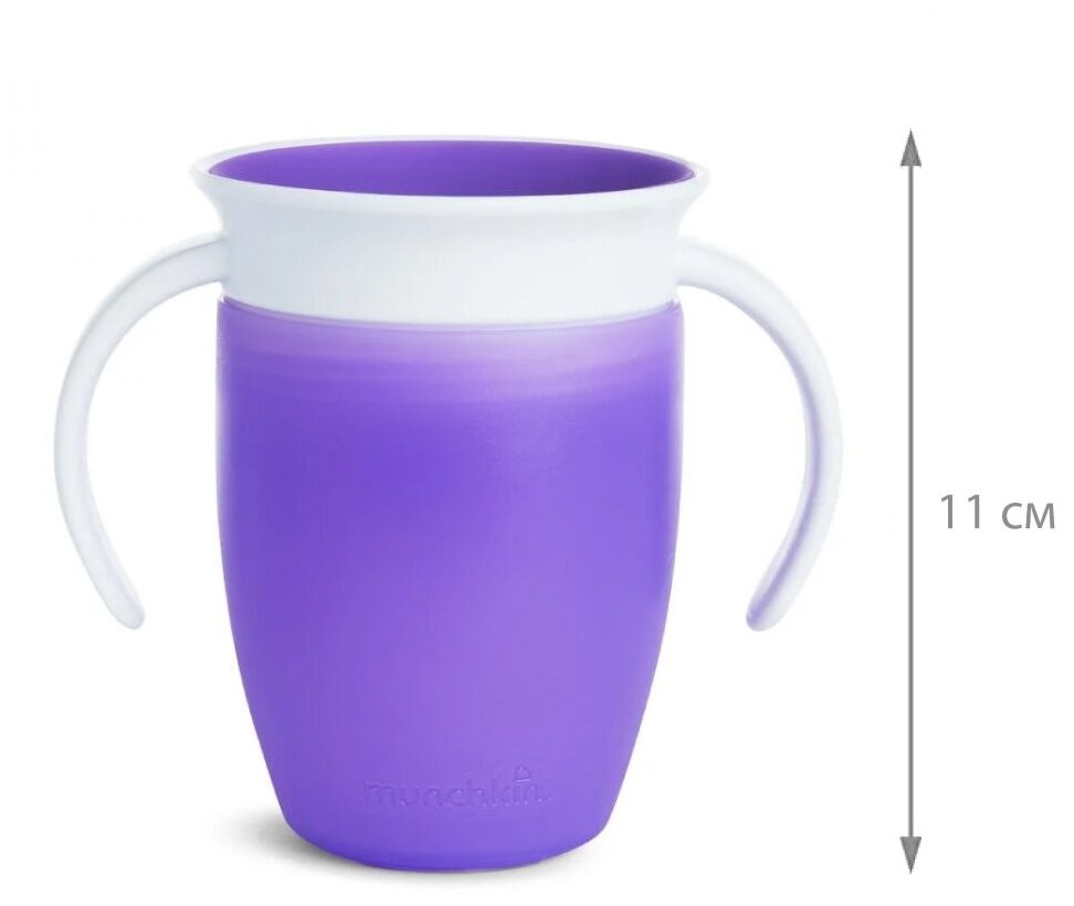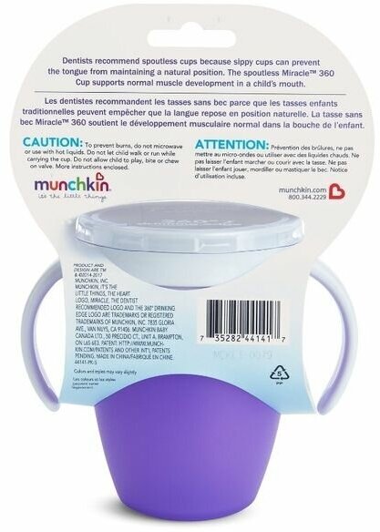 Munchkin поильник-непроливайкаMIRACLE® 360° Возраст: от 6 месяцев Держать такую прелестную вещь в руках — просто удовольствие! Поильник MunchkinMIRACLE® 360° создан с учетом потребностей как детей, так и родителей. Он предотвращает любые проливания напитка, а благодаря мягкому и гибкому материалу бережет зубы и десны малыша. Пить свой напиток малыш может по всей окружности - жидкость равномерно распределится под крышкой, под каким бы углом ребёнок не наклонил поильник. А еще поильник MunchkinMIRACLE® 360° помогает поддерживать нормальное развитие мышц во рту малыша. Никаких дополнительных носиком, соломинок и прочего, - поильник MunchkinMIRACLE® 360°прост в использовании и мытье. Из него можно пить сидя, на ходу и даже лежа! Поильник-непроливайка Munchkin создан специально для приучения малыша пить из взрослой чашки. Особенности и характеристики: герметичная конструкция поильника на 100% защищает от протекания жидкости специальная конструкцияMIRACLE® 360° позволяет пить по всей окружности бортика технология без горлышка лучше подходит для зубов малыша, а также позволяет быстрее приучить ребенка к взрослой чашке клапан, обеспечивающий полную защиту от разливания, автоматически закрывается после питья съемный клапан обеспечивает легкость в уходе и мытье удобные ручки, эргономичная форма 100%перерабатываемый материал можно мыть в посудомоечной машине не содержит Бисфенол А возраст: от 6 месяцев объем: 207 мл Поильникииспользоватьдля негустыхжидкостей. Для комфортного мытья и чистки бутылочек и поильников Munchkin используйтеЕршики для мытья поильников и бутылочек Munchkin.