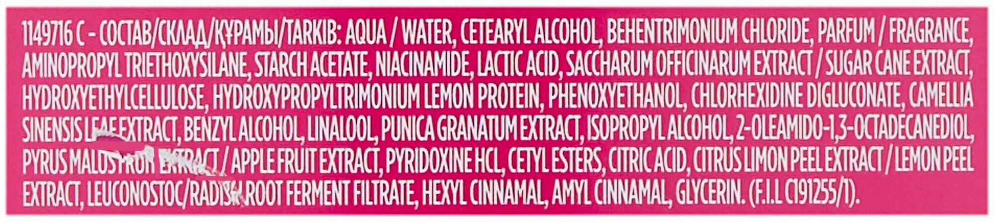| Состав | aqua, sodium laureth sulfate, coco-betaine, sodium lauryl sulfate, sodium chloride, glycol distearate, niacinamide, alcohol denat., saccharum officinarum extract / sugar cane extract, hydroxypropyl guar hydroxypropyltrimonium chloride, hydroxypropyltrimonium lemon protein, sodium hydroxide, phenoxyethanol, magnesium nitrate, magnesium chloride, aminopropyl triethoxysilane |