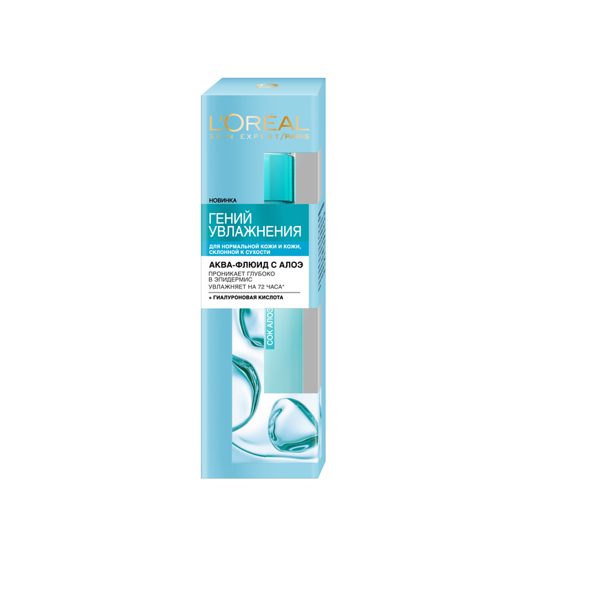 Аква-флюид для лица L'OREAL «Гений увлажнения», состоящий на 82% из очищенной воды, создан специально для нормальной кожи и кожи, склонной к сухости. При соприкосновении с кожей моментально превращается в жидкость и впитывается, интенсивно увлажняя кожу на 72 часа, не оставляя жирного блеска. Инновационный аква-флюид для лица – это альтернатива обычному увлажняющему крему. Его формула, обогащенная соком алоэ и гиалуроновой кислотой, действует на 5 слоях эпидермиса. Благодаря ему запас влаги в коже восполняется; естественный обмен веществ в клетках активизируется; защитные функции кожи восстанавливаются.