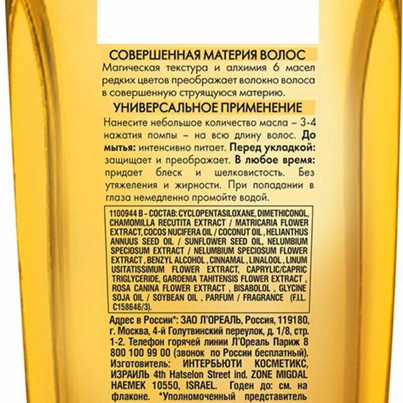 Магическая текстура и алхимия шести масел редких цветов которого восстанавливают волосы и преображают их в совершенную материю без утяжеления. Используя драгоценное масло до мытья волос, Вы сможете восстановить секущиеся кончики.