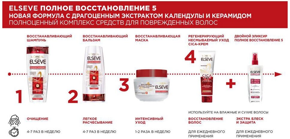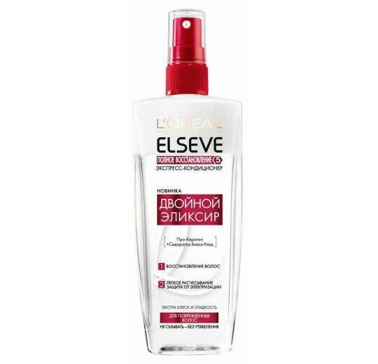 Восстанавливающий экспресс-кондиционер «Двойной Эликсир» – настоящее спасение для волос, поврежденных в результате регулярной укладки феном или осветления. Его новая формула, обогащенная Про-Кератином и сывороткой Блеск-Уход обеспечивает двойное действие: 1) выравнивает поверхность волос, делая их гладкими и придавая естественное сияние; 2) Значительно облегчает расчесывание, защищает от электризации и восстанавливает поверхность волос. Волосы мгновенно приобретают роскошный вид!