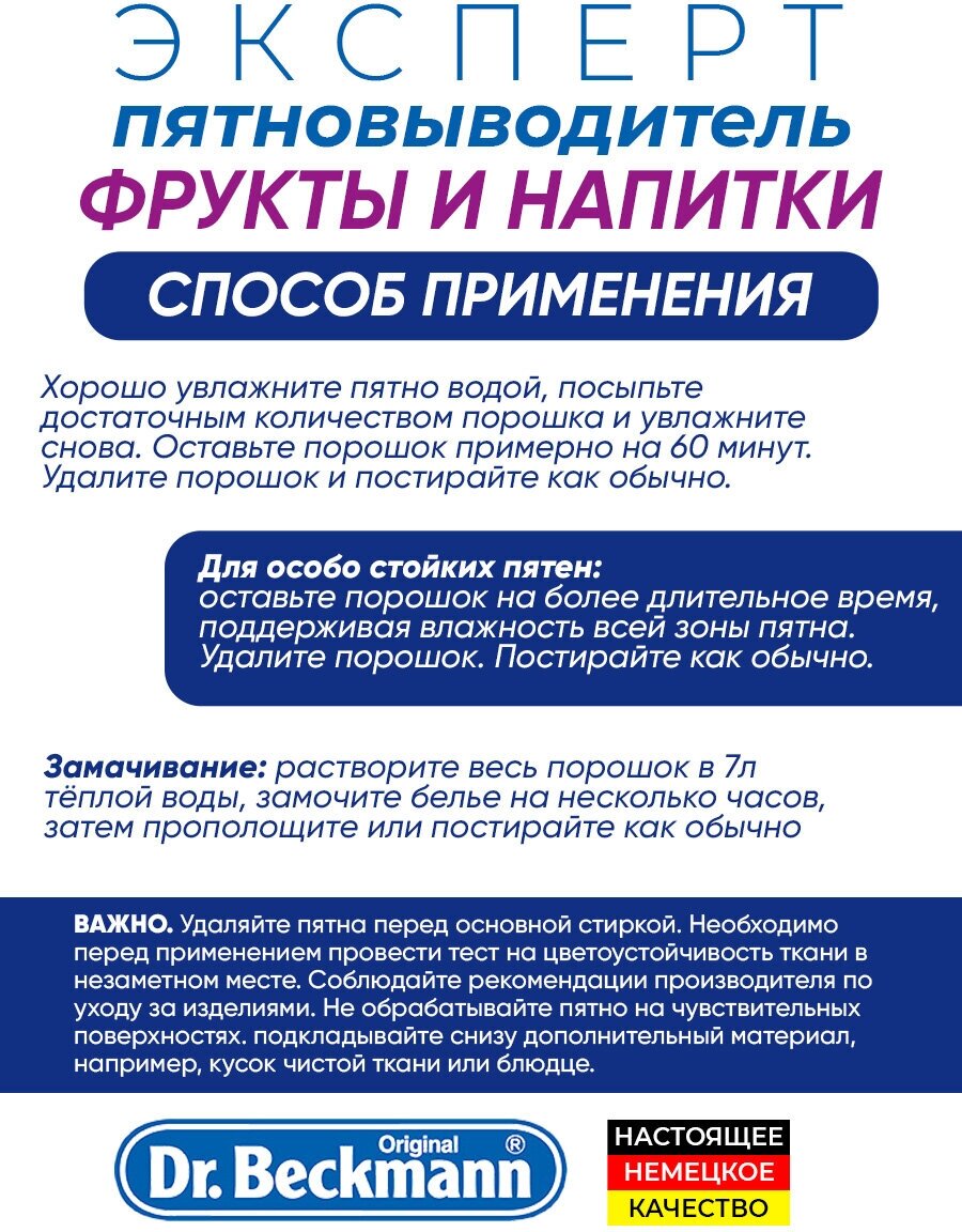 Пятновыводитель "Dr. Beckmann" обладает специальной формулой, которая удаляет пятна от фруктов, овощей, ягод и соков; алкогольных и кофейных напитков; колы; лимонада и варенья; детского питания, а также убирает плесень и грибок. Пятновыводитель не пригоден для ковров, кожи, шерсти, шелка и вискозы.Товар сертифицирован.Уважаемые клиенты! Обращаем ваше внимание на возможные изменения в дизайне упаковки. Качественные характеристики товара и его размеры остаются неизменными.