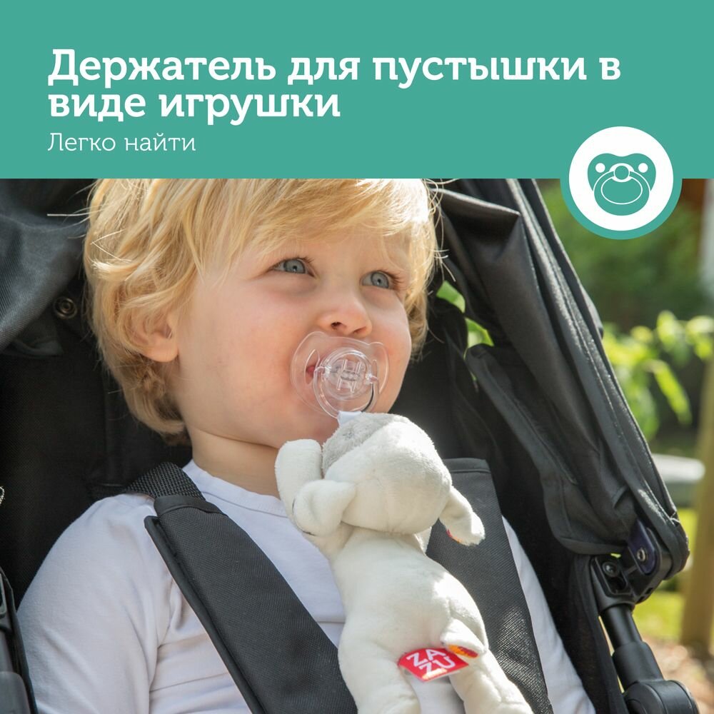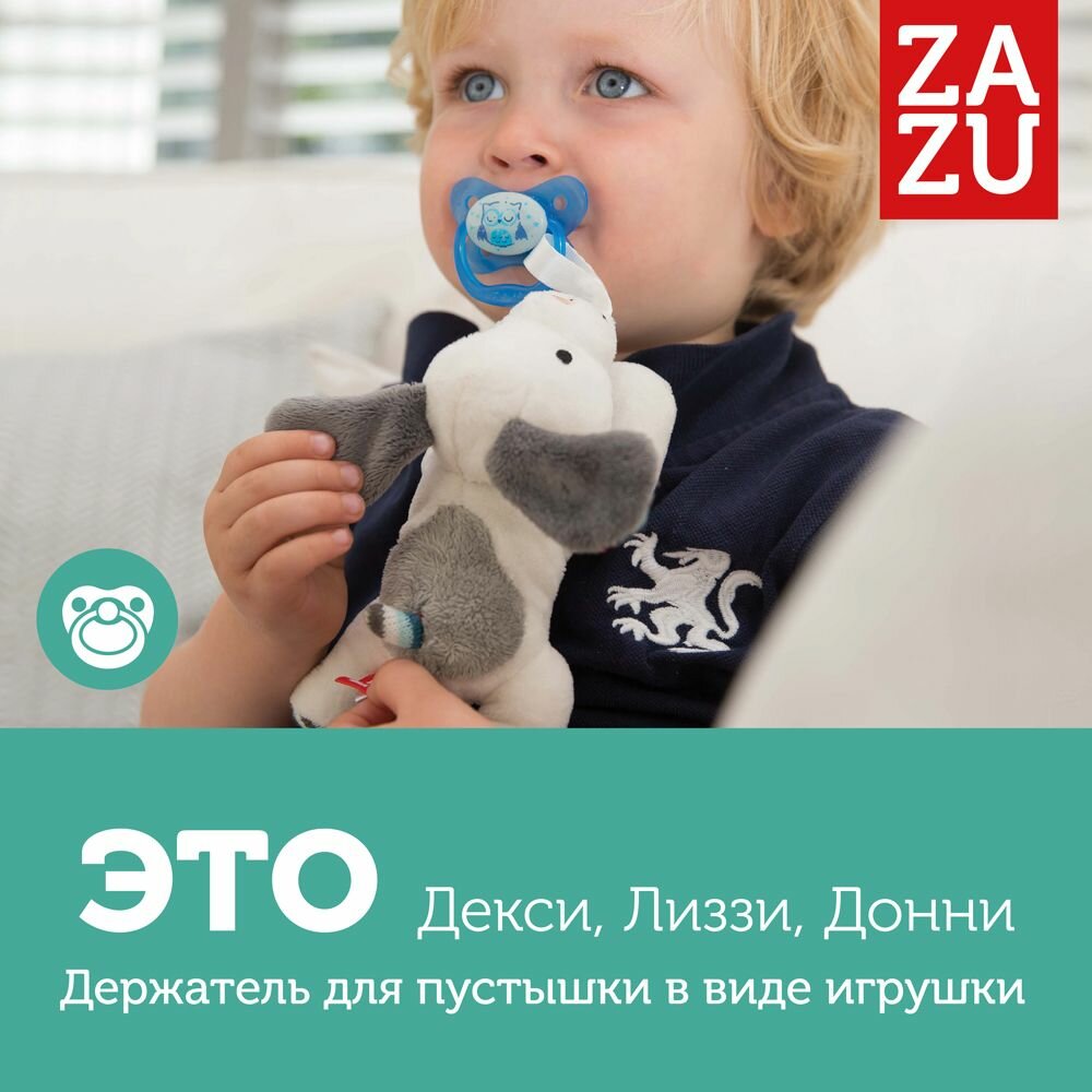 Больше никаких потерянных или испачканных пустышек! Держатель для пустышки с игрушкой ZAZU – это удобно и весело одновременно. Теперь соска будет всегда чистой и не потеряется, а красивая мягкая игрушка будет развлекать малыша. Универсально. Подходит практически для любой пустышки. Легко крепить. Быстро найти. Больше никаких потерянных пустышек. Удобно держать. Форма игрушки идеальна для маленьких ручек.