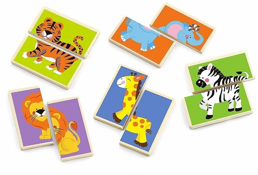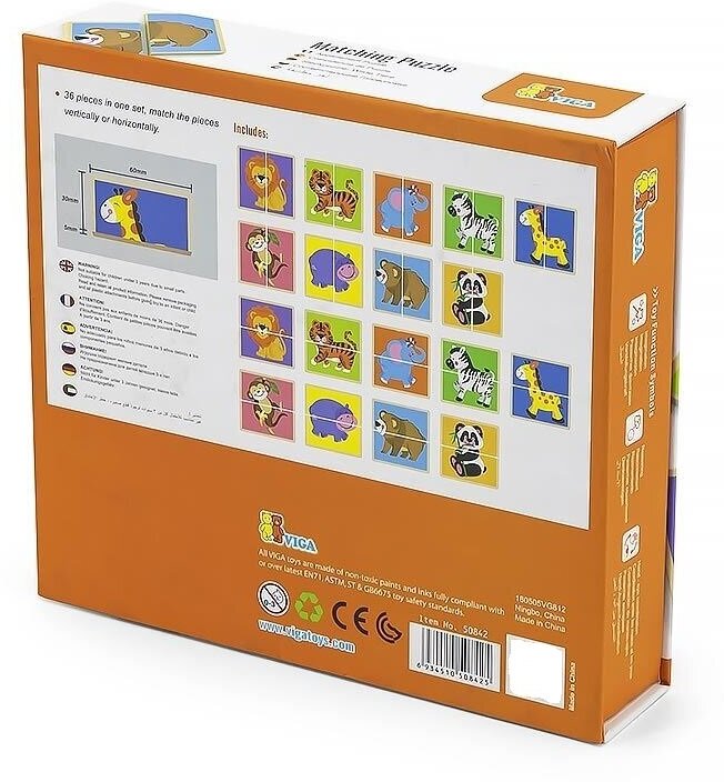 Приятный и полезный подарок вашему малышу-яркий деревянный пазл Дикие животные от VIGA, приведет в восторг каждого ребенка. Подарочный комплект для детей состоит из 36 деталей, изготовленных из древесины высокого качества, с нарисованными дикими животными. Малышу нужно найти и собрать всего 9 пазлов из двух частей (вертикального и горизонтального положения) каждой картинки животных: тигр, лев, жираф, зебра, обезьяна, бегемот, медведь, слон и панда. Пазлы предназначены для возраста от 3 лет, научат малыша сравнивать и отличать часть от целого. Все это способствует развитию мелкой моторики, мышления, воображения, творческих способностей, зрительно-моторной координации, математических навыков, укреплению памяти. Регулярно упражняясь в подобных занятиях, малыш станет более внимательным, сосредоточенным, любознательным. Развивающая игрушка отлично сочетается с методикой Монтессори, рекомендована для детских садов и центров развития.