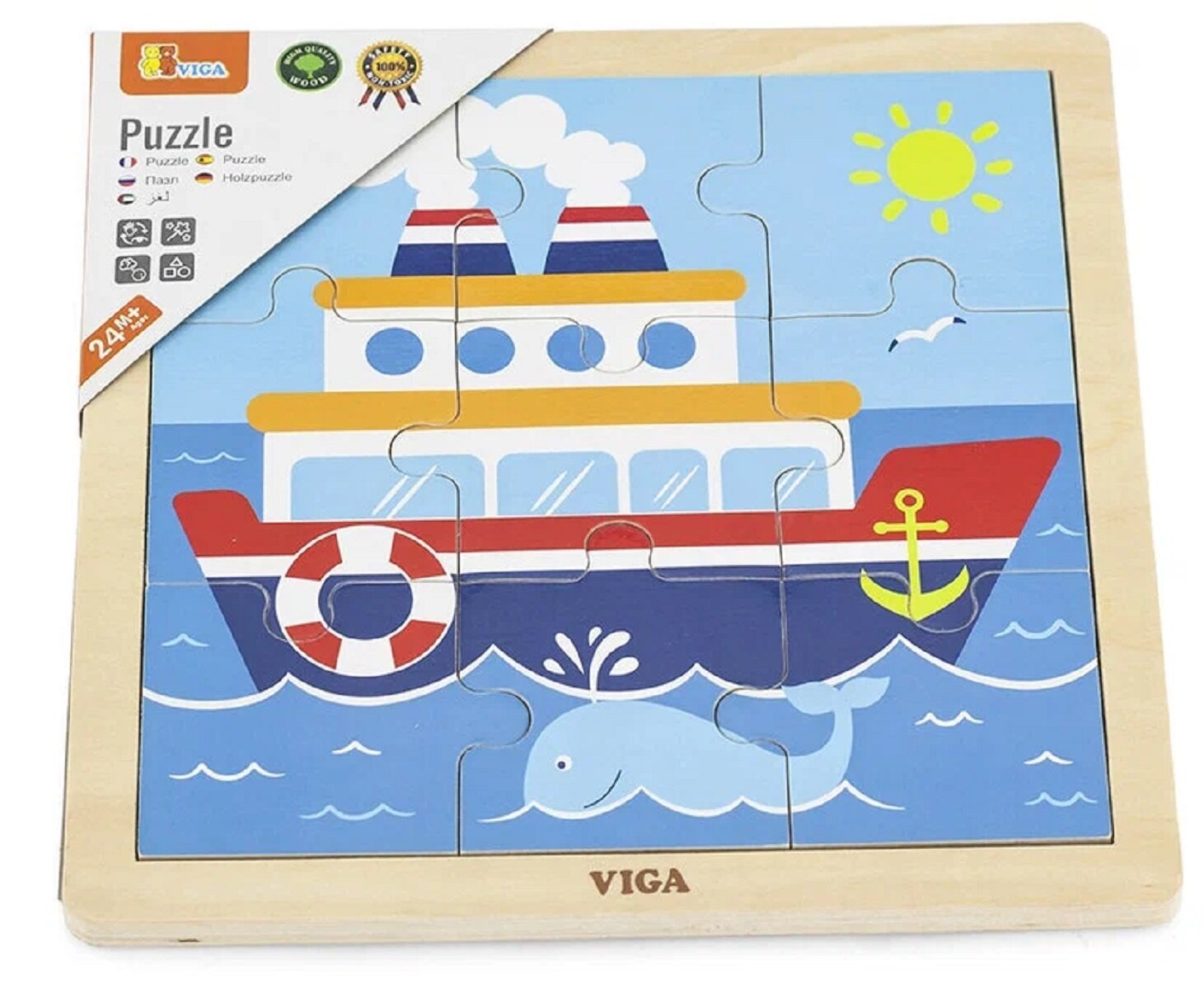 Деревянный пазл от Viga Toys Корабль – классическая развивающая игрушка для детей от 2 лет! Состоит из 9 деталей в деревянной рамке. Ребенку нужно собрать Корабль. Что дает ребенку сложение такой простой головоломки? Малыш получает как эстетическое удовольствие, так и практическую пользу. Во-первых, он расширяет кругозор: в деталях может рассмотреть и запомнить, как выглядит Пароход. Во-вторых, он развивается умственно: тренирует воображение, логическое и образное мышление, учится увязывать части и целое. Детские пазлы – универсальная полезная игра. Их используют дома и в детских садах, центрах развития. Пазлы отлично сочетаются с методикой Монтессори. Деревянный пазл Viga Toys Корабль из 9 элементов изготовлен из качественной и тщательно отшлифованной древесины, покрыт безопасными красками. Выполнен в соответствии со стандартами детских игрушек EN71 и ASTM. Размер квадратного пазла с основанием 22,5 см, толщина 1 см.