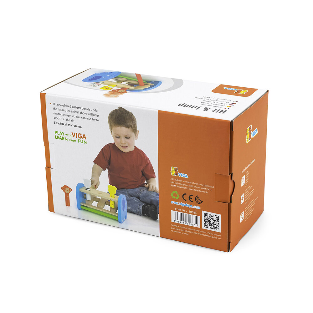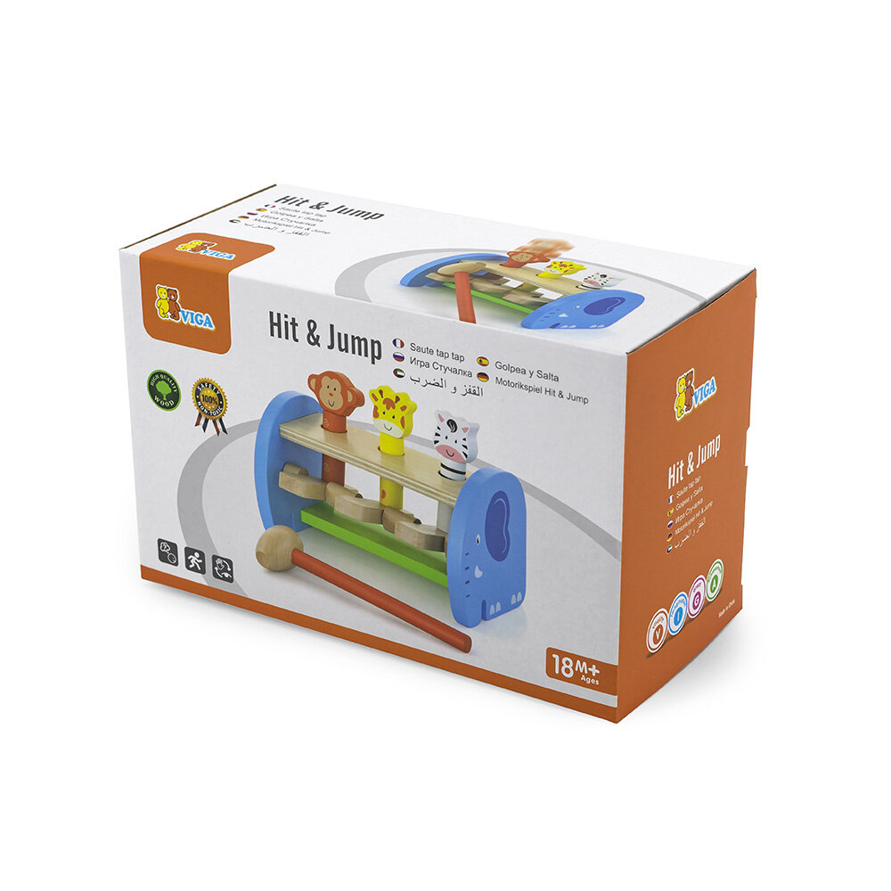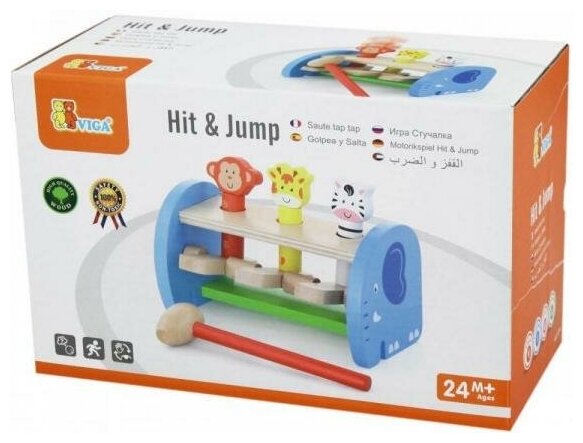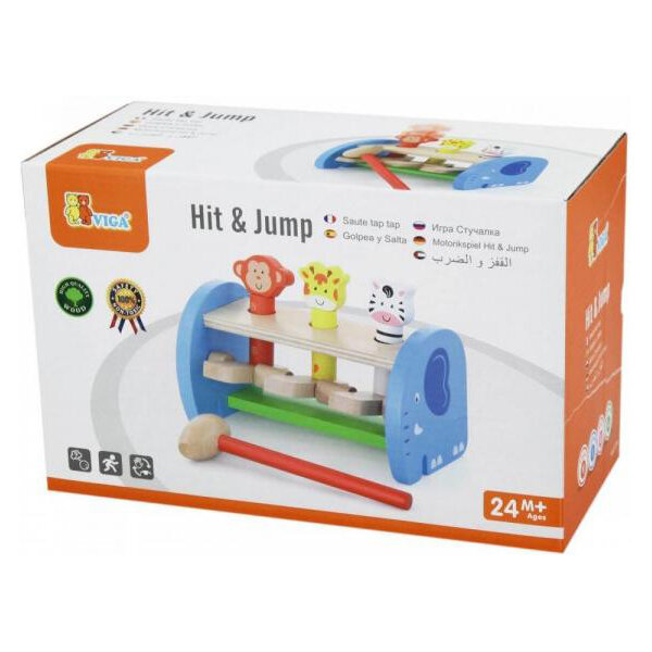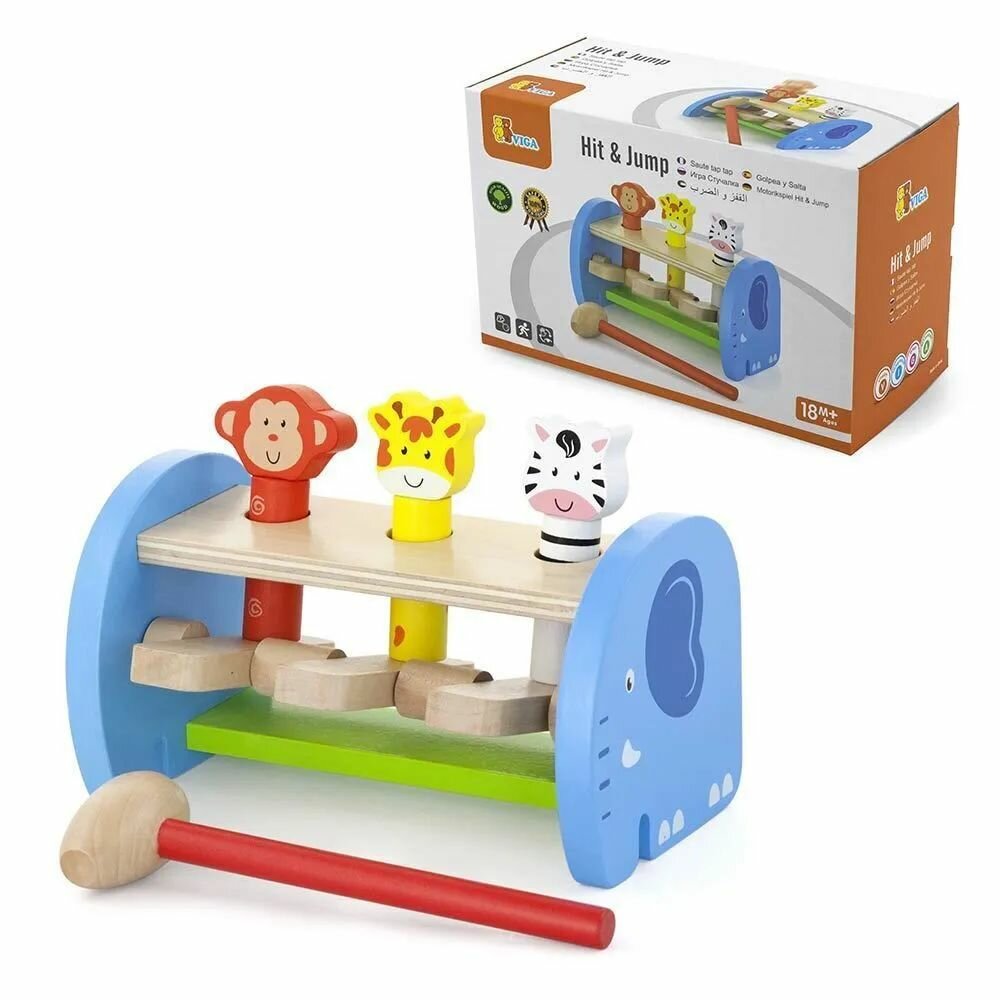 Набор состоит из деревянной подставки, трех стержней с фигурками животных и молотка. Ударяя молотком по клавишам под каждым из стержней, малыш видит как фигурки животных выпрыгивают вверх. Игрушка развивает силу рук, координацию рук и глаз.