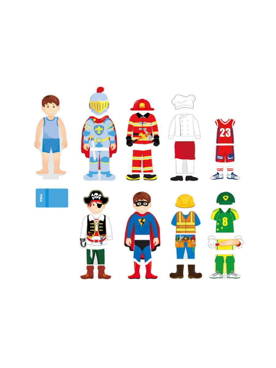 Набор магнитов Viga Toys (Вига Тойз) Гардероб мальчика позволит вашему ребенку увлекательно провести свое время. Набор включает фигурку мальчика и комплекты разной одежды. Все детали деревянные с магнитами. Ребенок может подбирать элементы гардероба и наряжать мальчика, к примеру, пожарным, пиратом, суперменом, рыцарем, поваром, футболистом - всего 8 образов.