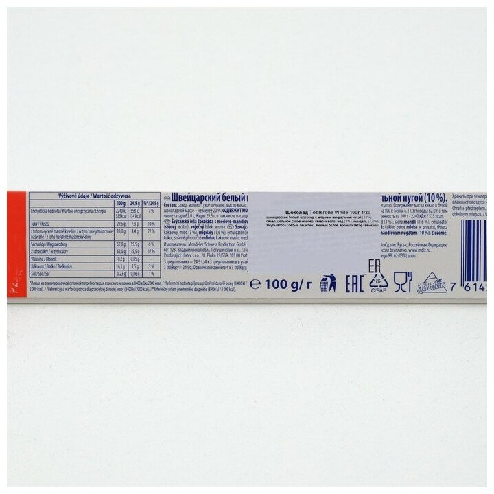 | Состав | сахар, масло какао, молоко сухое цельное, мед (3%), миндаль (1,6%), эмульгатор (соевый лецитин), яичный белок, ароматизатор ванилин. содержание масла какао в белой шоколадной массе не менее 20% |