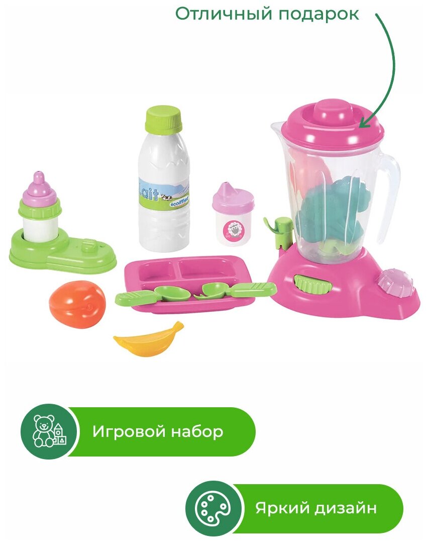 Игровой набор кормление малыша в чемоданчике – отличная игрушка, которая понравится каждой девочке, которая любит заботиться о своих куклах. В чемоданчике большой набор аксессуаров: блендер, фрукты, овощи, молочный флакон с держателем, тарелка, ложка, чашка для питья и бутылка молока. Набор поможет маленьким мамочкам организовать процесс кормления куклы.