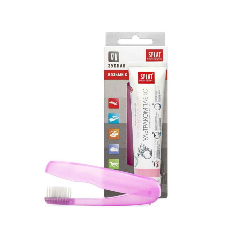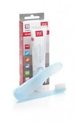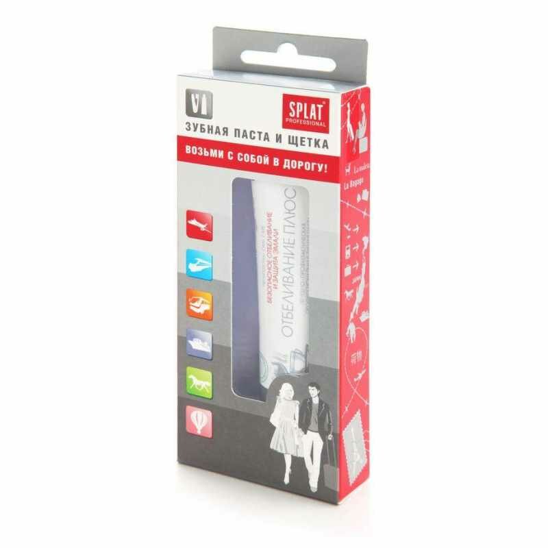 Описание товара:Дорожный набор Splat "Отбеливание Плюс": зубная паста, зубная щетка. Эффективная комплексная зубная паста содержит инновационную систему для безопасного отбеливания Sp.White System, благодаря которой зубы становятся светлее на 1.5 тона за 4 недели использования. Ионы калия заботятся о зубах в случае их повышенной чувствительности. Паста идеально подходит любителям кофе, чая и тем, кто курит. Не повышает чувствительности зубов. Округлые полирующие частицы в сочетании с компонентом Polydon и натуральными ферментами из папайи заметно осветляют эмаль, расщепляют налёт в труднодоступных местах и делают поверхность зубов идеально гладкой, что способствует сохранению белизны надолго. Натуральные антибактериальные компоненты препятствуют образованию налёта и заботятся о свежести дыхания. Фторид-ионы эффективно защищают от кариеса. Зубная паста содержит фтор (1000 ppm). Лечебно-профилактическая паста Splat "Отбеливание плюс" с выраженным отбеливающим и полирующим эффектом с округлыми частицами разного диаметра. Инновационная система отбеливания Sp.White System, расщепляет налет, полирует до блеска и безопасно отбеливает эмаль. Стильная складная дорожная зубная щетка Splat отлично очищает налет между зубами благодаря инновационной щетине с утонченными кончиками. Оригинальный дизайн и удобство в использовании щетки сделают ее вашим любимым попутчиком. Характеристики: Объем пасты: 40 мл. Размер щетки (в сложенном виде): 11 см х 2,5 см х 2 см. ГОСТ 7983-99.Состав товара:Aqua, Hydrated Silica, Hydrogenated Starch Hydrolysate, Patassium Nitrate, Dicalciun Phosphate Dihydrate, PEG-8, Calcium Pyrophosphate, Pentasodium Triphosphate, Aroma, Sodium Coco-Sulfate, Cellulose Gum, Sodium Monofluorophosphate, Titanium Dioxide, Sodium Lauroyl Sarcosinate, PVP, Sodium Methylparaben, Sodium Saccharin, Menthol, Papain, Limonene, Fluoride content - 0,1% (1000 ppm). Полипропилен.Меры предосторожности:Перед использованием новую щетку промыть в теплой воде с мылом.Способ применения:Рекомендуется чистить зубы минимум два раза в день после приема пищи.