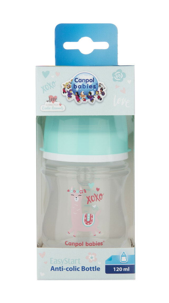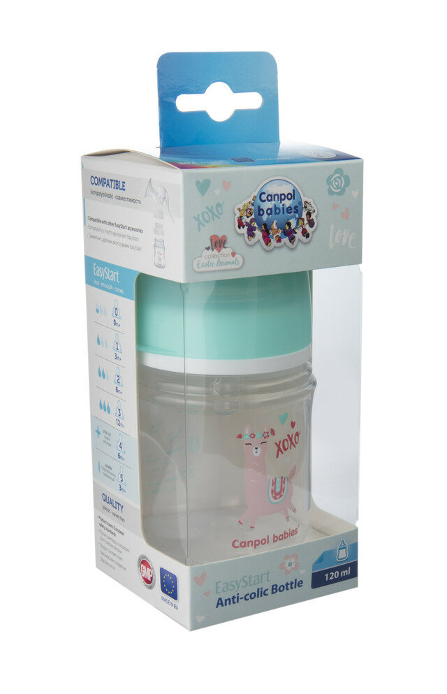 Антиколиковая детская бутылочка для кормления Canpol babies коллекции Exotic Animals легкая и прочная.Она обеспечит легкое начало грудного вскармливания и позволит сочетать грудное вскармливание и кормление из бутылочки.• Мягкий безопасный силикон.Соска сделана из исключительно мягкого гипоаллергенного силикона, не раздражает нежные десна малыша.Не имеет вкуса и запаха.• Антиколиковая система.Эффективный антиколиковый клапан предотвращает образование пузырьков воздуха в пище, уменьшает колики и чрезмерное скопление газов.• Эргономичная форма бутылочки.Обеспечивает комфорт во время кормления. Бутылочку легко и удобно держать в руках.• Соска бутылочки по форме напоминает материнскую грудь.Позволяет легко сочетать грудное вскармливание и кормление из бутылочки.• Широкое горлышко.Широкое горлышко позволяет легко промывать и наполнять бутылочку.• Точная и четкая мерная шкала.Облегчает процесс приготовления пищи.• Не содержит Бисфенол А.Бренд Canpol babies рекомендует грудное вскармливание, как самую здоровую форму кормления.Мы рекомендуем начинать давать молоко в альтернативной форме только после консультации с врачом, когда грудное вскармливание невозможно или недостаточно.Рекомендации по использованию:Перед каждым использованием промойте все части бутылочки и продезинфицируйте их: поместите на 5 минут в кипящую воду.Это делается для обеспечения гигиены. Кипячение и жесткая вода могут создать эффект известкового налета. Тщательно промойте все детали чистой водой.Бутылочку можно мыть в посудомоечной машине (максимальная температура 65 ℃), но без соски. Жесткие химикаты/моющие средства могут повредить её.Не используйте никаких антибактериальных средств. Не затягивайте стопорное кольцо бутылочки, так как это может нарушить вентиляцию соски.Не увеличивайте отверстия для подачи жидкости, так как это может повредить соску.Будьте осторожны при подогреве в микроволновой печи. Всегда перемешивайте пищу, чтобы обеспечить равномерное распределение температуры, проверяйте температуру жидкости, прежде чем давать ее ребенку.Разогревая пищу в микроволновой печи, не забудьте оставить бутылку открытой. Не ставьте изделие в горячую духовку и не разогревайте на газовой/электрической плите.*Европейское качество. Сделано в Польше. *Бренд Canpol Babies уже более 30 лет помогает мамам во всем мире растить своих малышей здоровыми и счастливыми.В ассортименте бренда более 500 позиций в категориях Аксессуары для кормления, пустышки, поильники и другие.