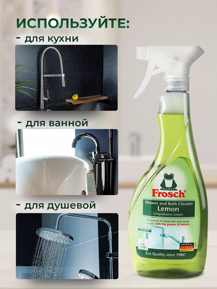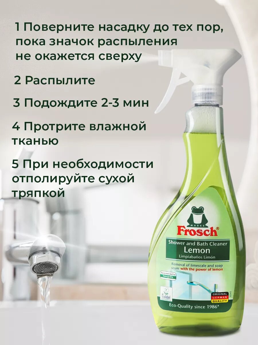 Очиститель для ванны и душа Frosch Цитрус – эффективное и универсальное средство для очистки всех поверхностей в ванной комнате, для раковин, ванн, унитазов, кафеля, нержавеющих поверхностей, в форме спрея с триггером, для быстрой и простой уборки. Чистящий спрей с натуральным составом эффективно снимает известковые отложения, грязь, следы от водяных капель и мыла. Оставляет после себя свежий запах чистоты и сияющий блеск. Мягкий состав средства подходит для пластиковых и акриловых поверхностей. Не содержит фосфатов и формальдегидов. Способ применения: Поверните насадку влево, чтобы символ распылительной головки оказался вверху. Просто распылите Очиститель для душа и ванной комнаты Frosch на покрытые известковым налетом или нуждающиеся в очистке поверхности, оставьте ненадолго, затем уберите мокрой тряпкой или смойте известковые отложения и грязь. Затем вытрите сухой тряпкой и поверхности снова засияют чистотой.