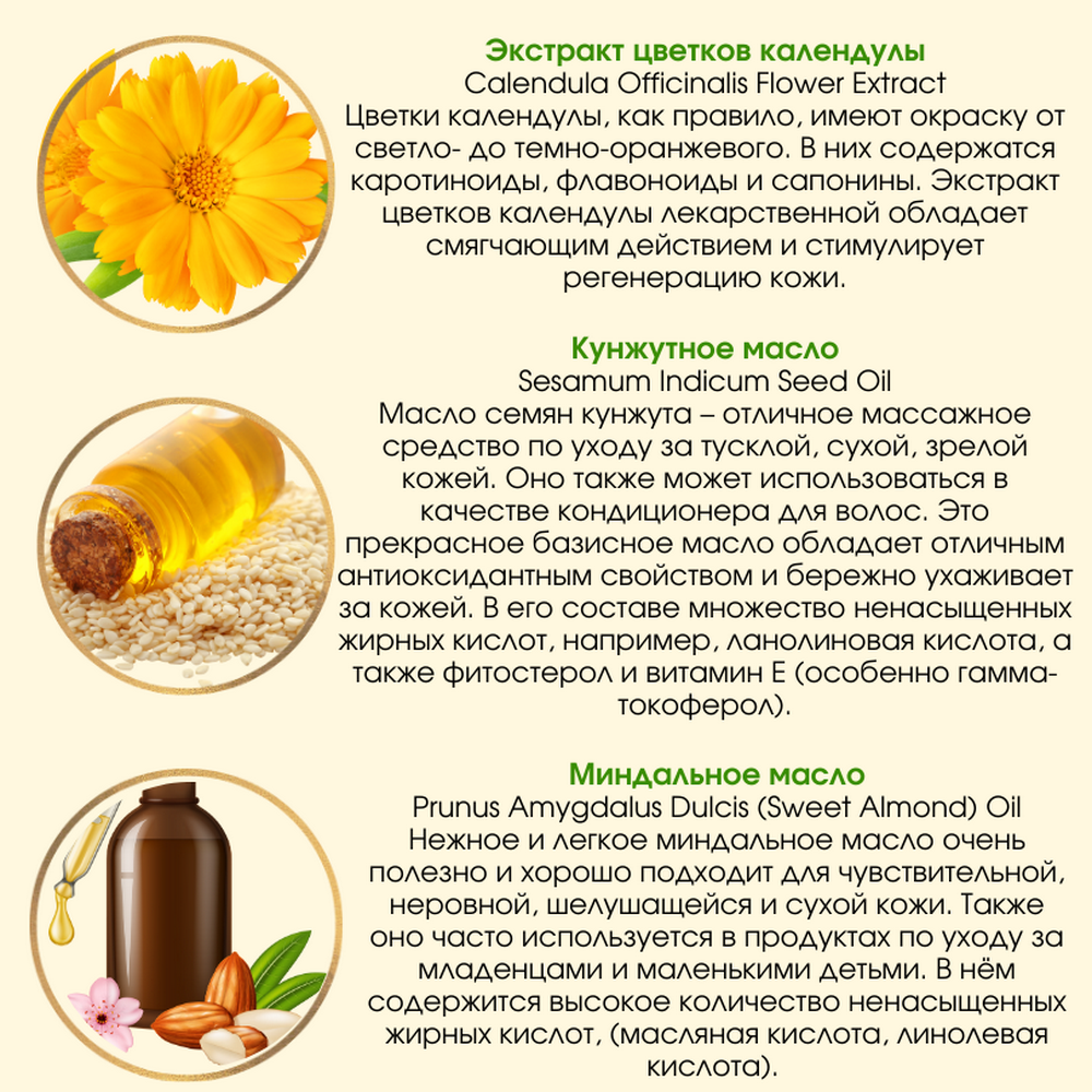 | Состав | вода; масло сладкого миндаля; масло семян кунжута; спирт; растительный глицерин; глицерид олеиновой кислоты; экстракт цветков календулы; смесь натуральных эфирных масел; мыло из пчелиного воска; ксантан |