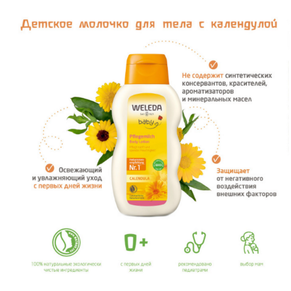 Применяется с первых дней жизни. Содержащиеся в молочке растительные масла способствуют предотвращению потери влаги, что делает кожу малыша нежной и мягкой. Экстракт календулы очищает и успокаивает чувствительную кожу. Смесь натуральных эфирных масел, придают молочку для купания нежный свежий аромат, который успокаивает и умиротворяет ребенка. 100% натуральный продукт. Не содержит синтетических консервантов, красителей и ароматизаторов.