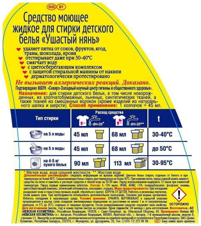 Назначение: для стирки детского белья, в том числе новорожденных, из хлопчатобумажных, льняных, синтетических тканей, а также тканей из смешанных волокон (кроме изделий из натурального шелка и шерсти) в автоматических стиральных машинах и машинах активаторного типа и вручную.Способ применения: для сильнозагрязненного белья и в регионах с высокой жесткостью воды дозировку средства увеличить на 2/3 колпачка.Дополнительные рекомендации: следуйте указателям на ярлыках изделий.Цветное белье стирайте отдельно от белого и при температуре не выше +60'C. Сильно линяющее белье стирать при температуре не выше +30'C. При наличии проблемных пятен, перед стиркой налить немного средства на пятно и замочить в растворе средства в теплой воде на 20 - 30 минут. Перед первым применением взбалтывать. Состав: нпав (15-30%), апав (5-15%), мыло (5-15%), поликарбоксилат (