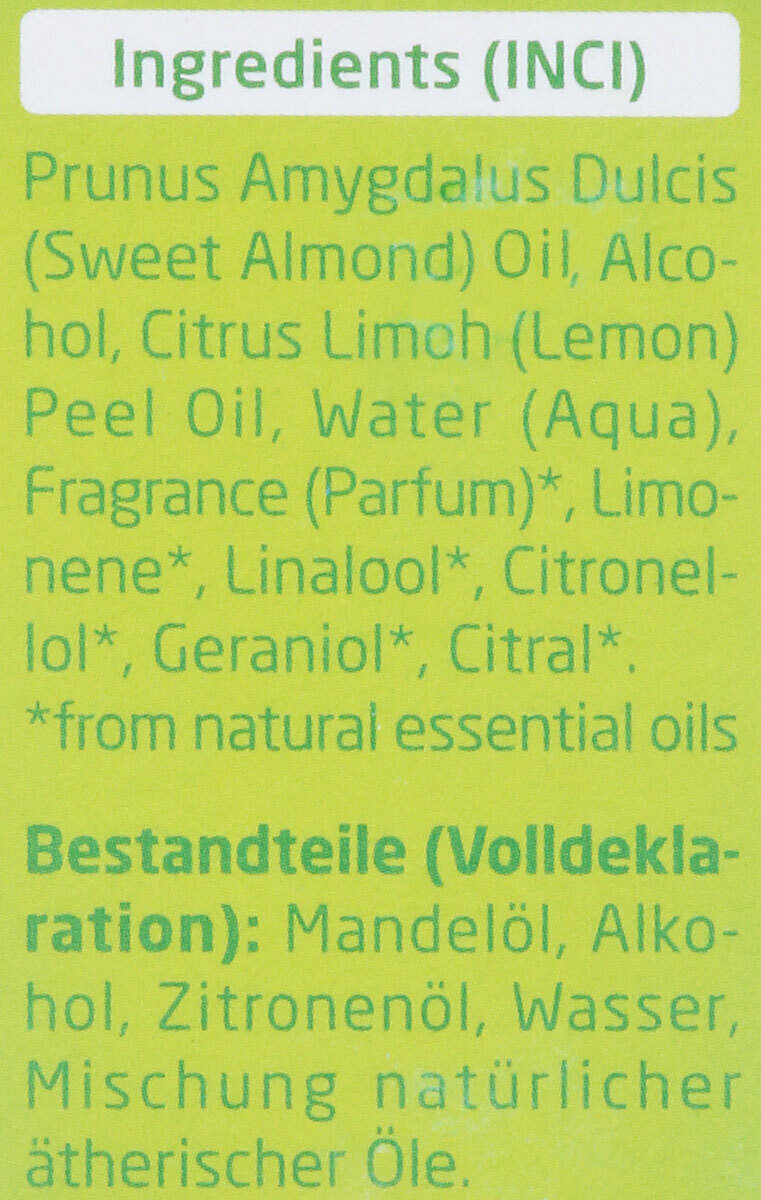 | Состав | миндальное масло, спирт, лимонное масло, вода, аромат, лимонен, линалоол, цитронеллол, гераниол, цитраль |