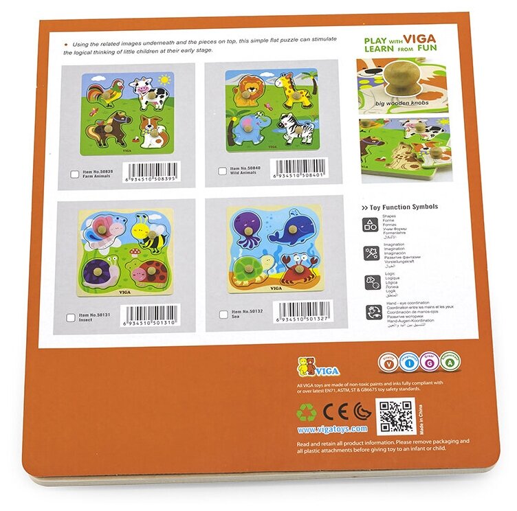 Пазл-вкладыш Viga "Насекомые" - это интересная игрушка, которая будет служить не только традиционным пазлом, но и полезным инструментом для тренировки зрительно-двигательной координации, логического мышления и изучения названий некоторых насекомых. Развивающая игрушка подходит для занятий по методике Монтессори. Рекомендована для игр дома, в детских садах и центрах развития.Особенности рамки-вкладыша:- яркая головоломка состоит из 4-х вкладышей в виде забавных насекомых и рамки с выемками для них;- ребенку необходимо понять куда и каким образом вставить фигурку, увидеть связь между частями и целым;- внутри каждой выемки изображен контур животного, который поможет малышу сделать правильный выбор;- рукоятка поможет держать и переносить вкладку, не спутав лицевую сторону с оборотом.Составляющие игрушки выполнены из экологически чистого сертифицированного бука и окрашены нетоксичными красителями. Все края сглажены, а поверхности тщательно отшлифованы.