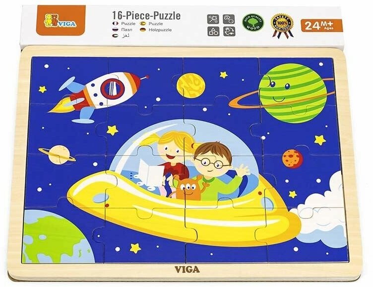 Красочный развивающий пазл для детей от 2 лет Космос от компании Viga Toys познакомит ребят с загадочным космосом, обучит восприятию форм и чувству пространства, стимулируя разные виды чувств: зрения и тактильных ощущений.Пазл-вкладыш развивает сенсорику, мелкую моторику, зрительно-моторную координацию, логику и воображение. Малыш учится думать, фантазировать в игровой форме.Деревянный вкладыш для малышей состоит из 16 ярких элементов, нужно собрать пазл, сопоставив не только картинку, но и форму соответствующих элементов, отделив части от целого.Детская игрушка гипоаллергенна, изготовлена из натуральной древесины и покрыта нетоксичными красками, все детали тщательно отшлифованы.Тематический пазл из крупных, качественно прорисованных пазлов, никого не оставит равнодушным и отлично подойдет для знакомства с цветом и формами предметов. Отлично сочетается с методикой Монтессори и рекомендован для детских садов и центров развития.