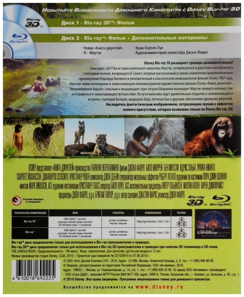 Шикарная экранизация английского писателя Редьярда Киплинга. Практически все по книге, благодаря современному кинематографу многие сцены из книги переданы зрителю с особыми деталями, говорящая змея Ка, юморной медведь Балу и многие другие персонажи и все это с примесью 3D. Кстати спецэффекты 3D есть и выполнены очень впечатляюще. Однозначно к просмотру в кругу семьи. Издание выполнено на 100 баллов, отличный русский дубляж, много дополнительных материалов, битрейт соответствует Full HD. Однозначно в коллекцию.