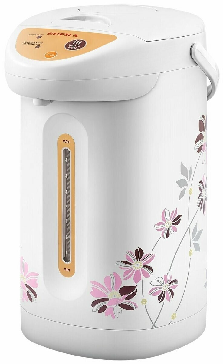 Термопот Supra TPS 3003 flower Изготовленный из высококачественного пищевого пластика термопот SUPRA имеет приятный современный дизайн: белый цвет корпуса украшен стильным цветочным узором. Данная модель мощностью 760 Вт в считанные минуты вскипятит воду для ваших любимых горячих напитков и будет поддерживать ее нагретой, затрачивая мощность 35 Вт и экономно расходуя электроэнергию. Вода оптимальной температуры будет к вашим услугам в любое время. Термопот SUPRA имеет объем 4 л.