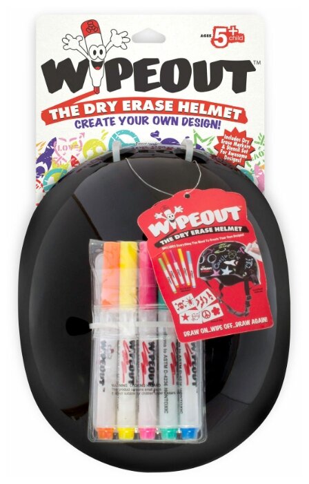 Создай свой дизайн! 5 разноцветных маркеров и 8 трафаретов в комплекте. Старый рисунок легко стирается без воды. Соответствует стандартам безопасности США CPSC и ASTM для велосипедных шлемов, защите в скейтбординге и трюковых роликах . Маркеры из комплекта легкостираемы, нетоксичны и соответствуют стандарту США ASTM D-4236 - о художественных материалах и их безопасности для здоровья.