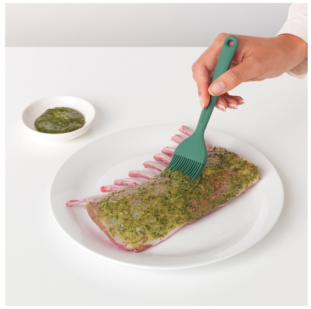 Brabantia Кисть кондитерская Особенности: Силиконовая кисть с длинным ворсом идеально подходит для смазывания форм для выпечки, глазирования торов и пирожных, а также нанесения жира или соуса на мясо во время жарки Изделие изготовлено из термостойкого силикона Подходит для мытья в посудомоечной машине Удобно хранить - петелька для подвешивания. Размер: 17.4х3.8х1.1 см.