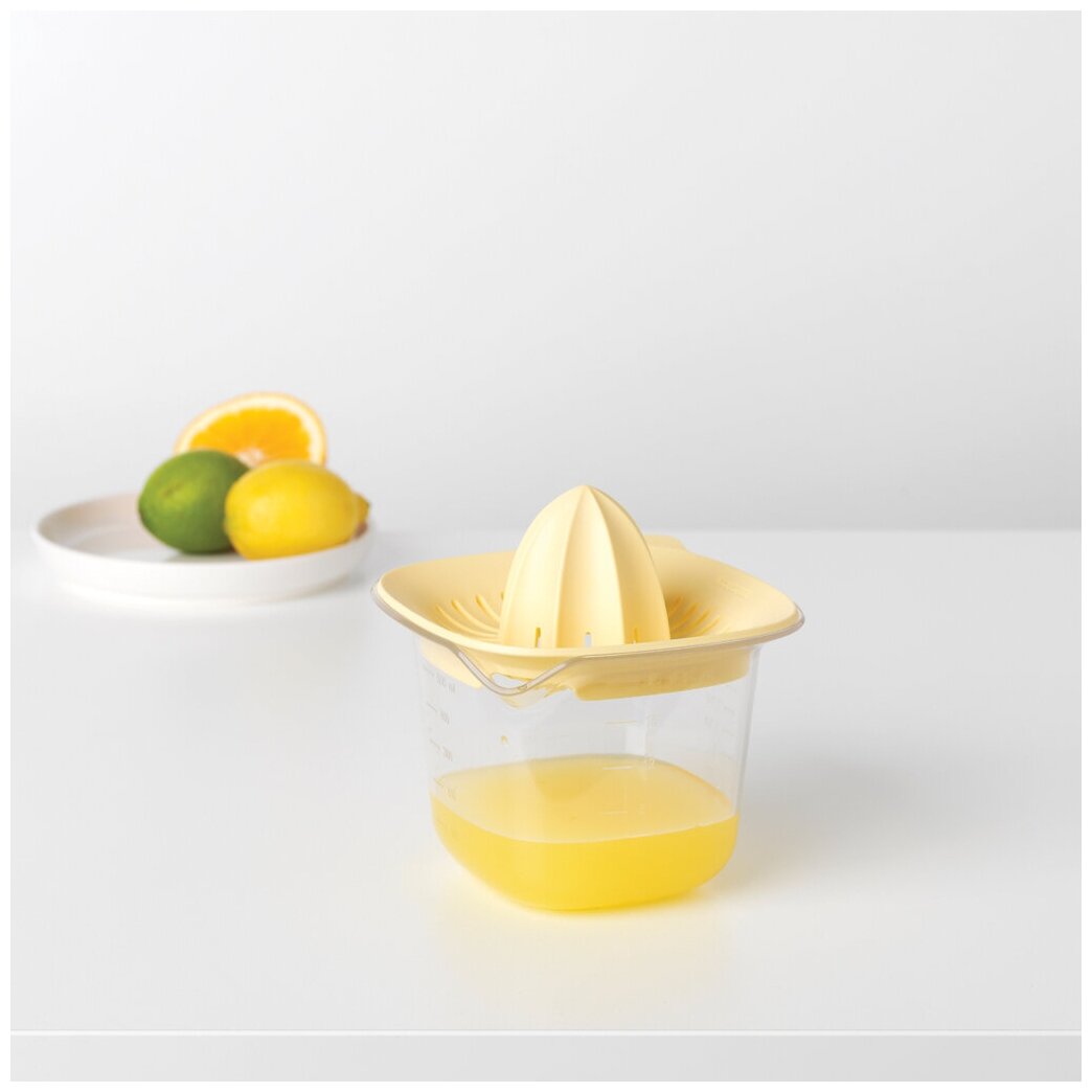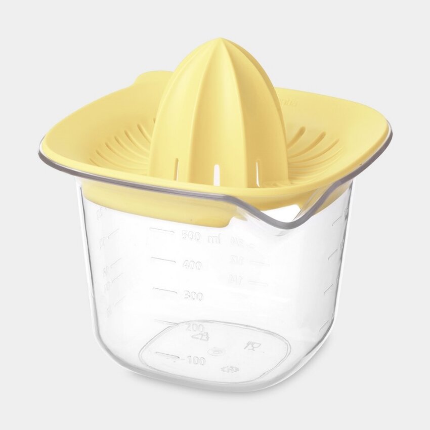 Brabantia Мерный стакан-соковыжималка 500 мл Особенности: Соковыжималка подходит для приготовления сока из любых цитрусовых Четкие мерные деления в мл, пинтах, стаканах и жидких унциях Вместимость 500 мл Удобно держать во время использования - прямоугольная форма Экономия места на кухне и удобное хранение - изделия составляются одно в другое Легко моется - можно мыть в посудомоечной машине. Размер: 13.2х13х13 см.