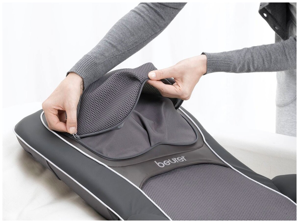 | Прочие особенности и свойства | 3D-массаж спины глубокого действия Массаж спины и шеи шиацу Точечный и частичный массаж Продольный роликовый массаж Возможность выбора массажной зоны (верхний или нижний отдел спины, вся спина) 2 скорости движения массажных роликов Подключаемая функция инфракрасного подогрева и подсветки Простой и удобный пульт управления Таймер на 5, 10 или 15 минут процедуры Автоматическое отключение через 15 мин работы Покрытие из искусственной кожи, мягкого велюра и "дышащей" ткани Mesh Чехлы для шеи и спины можно стирать при 40°С Съемная подушка сидения Удобная вешалка для размещения массажера в шкафу |