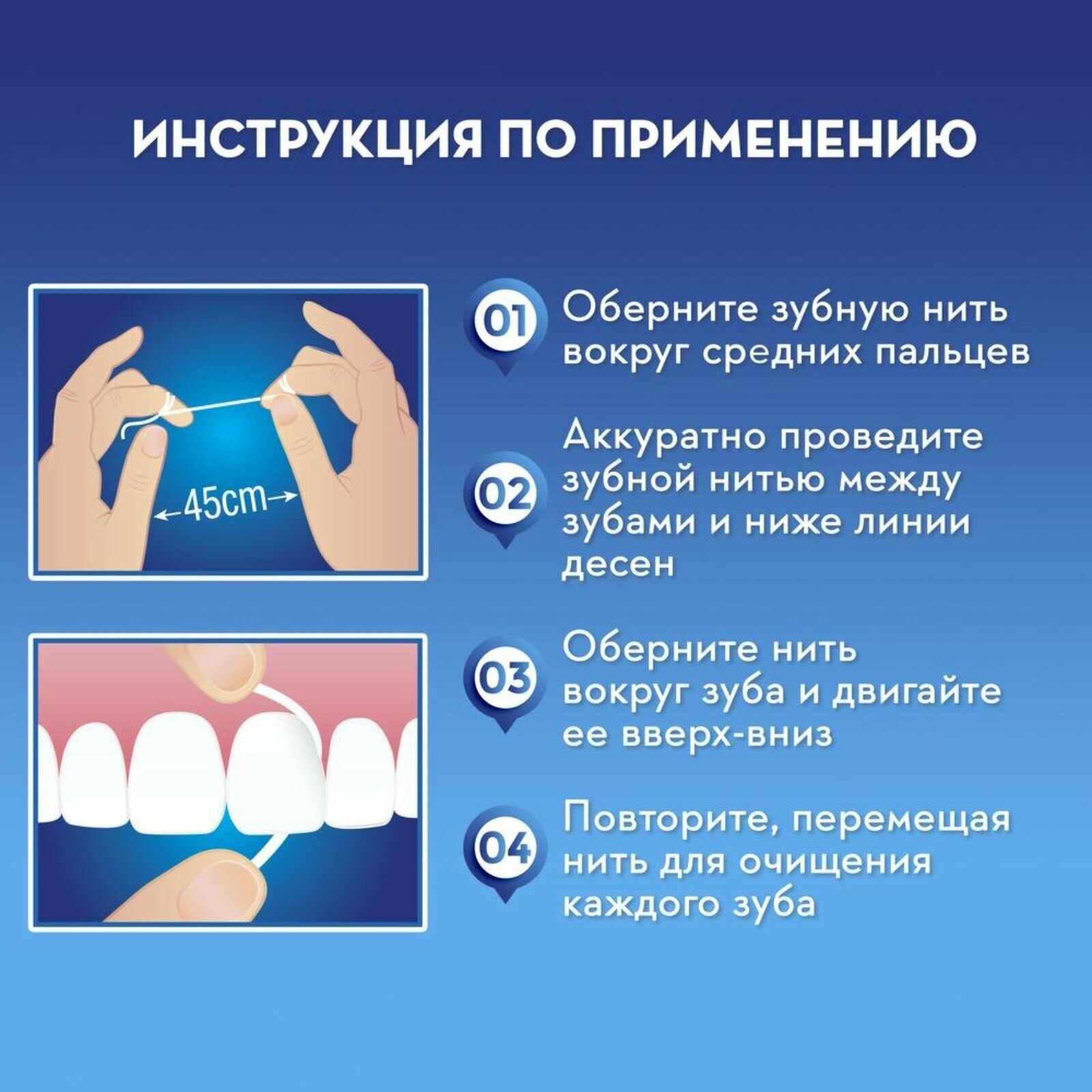| Способ применения | Оберните отрезок нити длиной 5 сантиметров вокруг средних пальцев. Осторожно проведите нить между зубами до линии десен. Поверните нить так, чтобы охватить наибольшую поверхность зуба. Аккуратно перемещайте нить вверх и вниз. Используйте новый участок зубной нити для каждого зуба. |