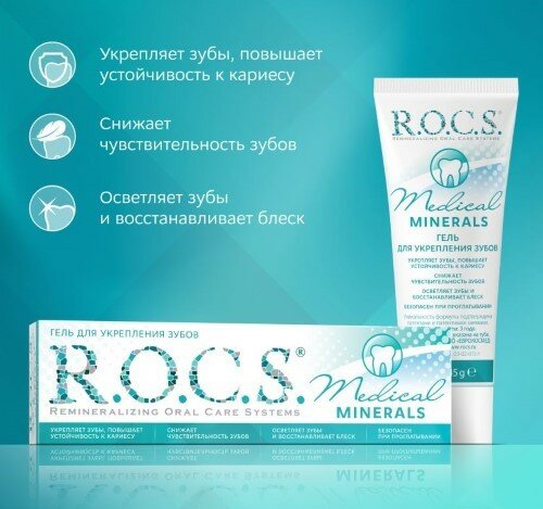 Уникальный реминерализующий гель для укрепления зубов R.O.C.S. «Medical Minerals» со вкусом клубники является богатым источником биологически доступных соединений фосфора, кальция и магния. Гель не имеет возрастных ограничений в использовании; главным образом, он ориентирован на подростков и детей в возрасте от 0 лет. Эффективность запатентованной формулы R.O.C.S. «Medical Minerals» доказана исследованиями. Продукт не содержит фтор, обеспечивает бережный уход за полостью рта и защиту от кариеса; в течение короткого времени восстанавливает прочность и белизну эмали, устраняет эстетические недостатки и т.д.; безопасен при проглатывании. Реминерализующий гель РОКС «Medical Minerals» со вкусом клубники предназначен для детей и подростков. Он может использоваться, начиная с первых месяцев жизни ребенка. Также, продукт подходить для ухода за зрелой эмалью. Помимо общеукрепляющего профилактического назначения, регулярное применение восстанавливающего геля для зубов R.O.C.S. «Medical Minerals» рекомендовано в следующих случаях: - для высокоэффективной профилактики кариеса (в том числе, на стадии белого пятна); - при симптомах повышенной чувствительности зубов; - для устранения эстетических недостатков при клиновидных дефектах, флюорозе и эрозиях; - при дефиците необходимых минералов вследствие диеты, не сбалансированного питания и т.д.; - для восстановления здорового внешнего вида зубов после использования брекет-систем; - в период восстановления организма в процессе или после курсов лучевой и химиотерапии. Укрепляющий гель для зубов R.O.C.S. «Medical Minerals» не содержит фтор. Он может свободно использоваться при наличии признаков флюороза или риске повышенного попадания фтора в организм человека (при чрезмерном содержании этого микроэлемента в питьевой воде, либо в составе регулярно принимаемых препаратов). При правильном регулярном использовании, реминерализующий гель РОКС для детей «Medical Minerals» со вкусом клубники: - обеспечивает насыщение эмали активными минералами; - быстро и надолго снимает симптомы повышенной чувствительности зубов; - эффективно защищает от кариеса, в том числе, обеспечивает его комплексную профилактику; - возвращает красивый блеск эмали; - позволяет улучшить/восстановить внешний вид зубов при флюорозе, после лечения брекет-системами и др.; - осветляет эмаль в среднем на 2 оттенка (отбеливающий эффект достигается без использования агрессивных веществ, а исключительно путем естественной реминерализации); - подавляет активность вредоносных бактерий, нормализует состав микрофлоры ротовой полости. Эффективность использования геля подтверждена лабораторными и клиническими исследованиями. Противопоказания Индивидуальная (крайне редкая) непереносимость отдельных компонентов продукта.
