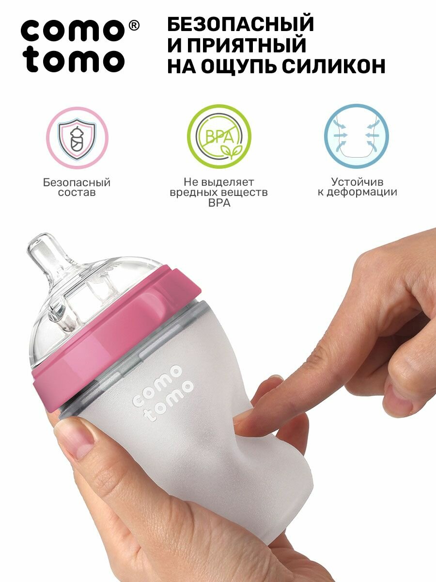 Силиконовая бутылочка Comotomo изготовлена из нежнейшего силикона. Силикон прекрасно проводит и сохраняет тепло, что позволяет малышу непрерывно ощущать материнскую заботу. Анатомическая форма корпуса максимально напоминает материнскую грудь, а ее приятная матовая поверхность не позволяет малышу выронить бутылочку из маленьких ручек. Содержит антиколиковый клапан, который препятствует возникновению колик у малыша. Благодаря широкому горлышку бутылочку Comotomo удобно мыть руками, без использования специальных щеток, Больше никаких дополнительных расходов и лишних предметов у вас дома. Корпус бутылочки содержит удобную градуированную шкалу, благодаря которой, вы не ошибетесь, при кормлении малыша детскими смесями. Состав бутылочки не содержит красящих элементов - она абсолютно безвредна и рассчитана на долговечное использование.