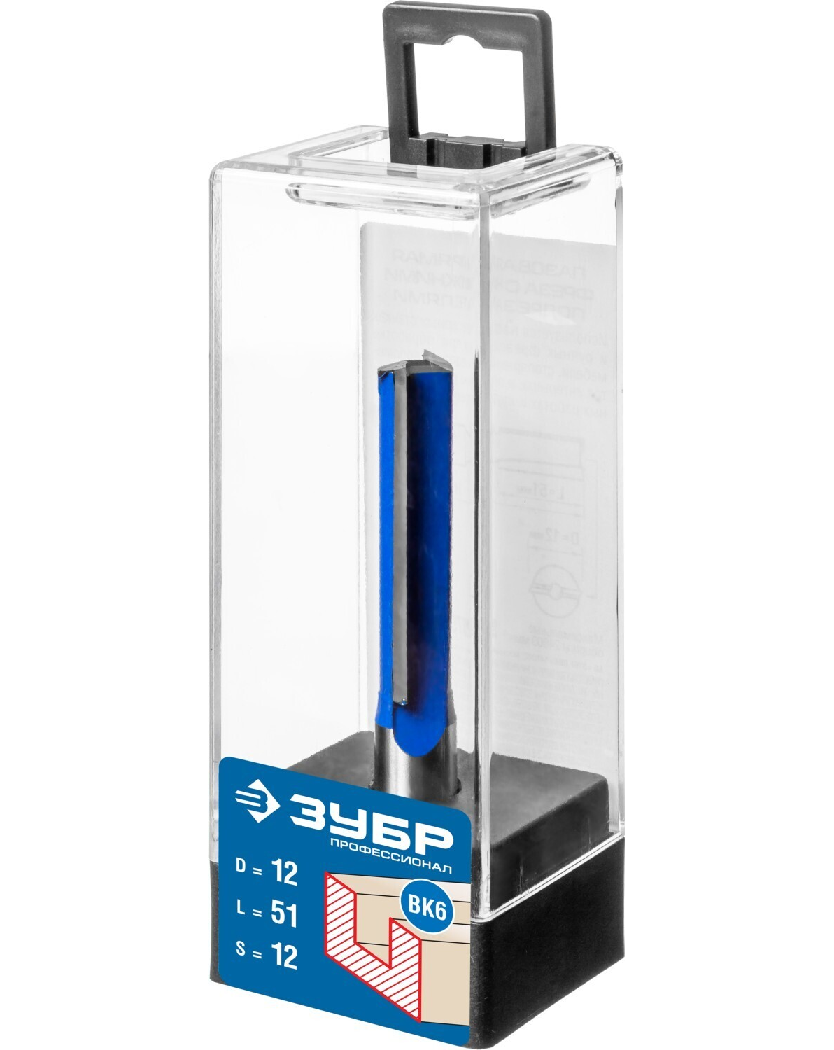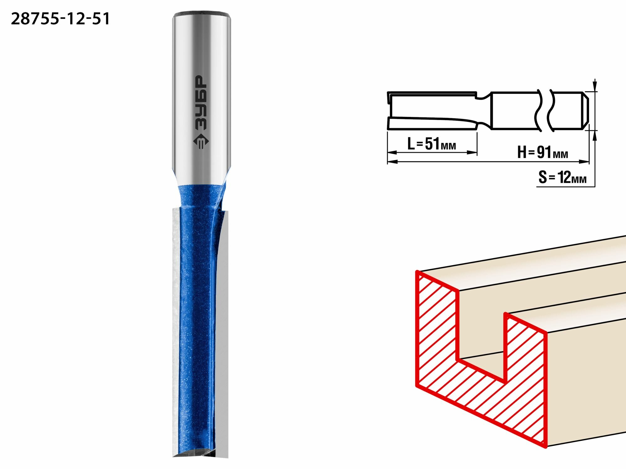 Фреза пазовая прямая с нижними подрезателями, D= 12мм, рабочая длина-51мм, хв.-12 мм, ЗУБР Профессионал
