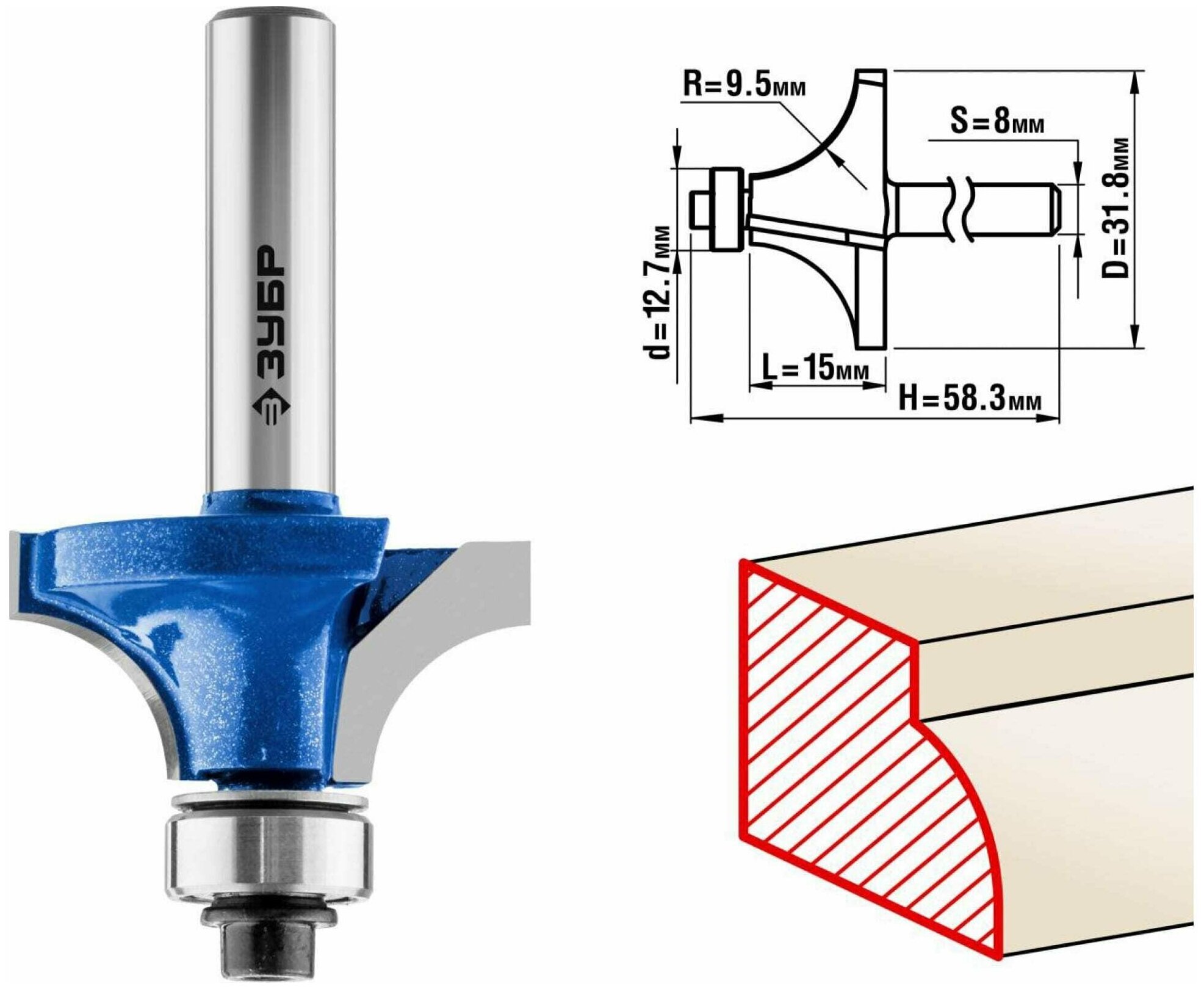 Фреза кромочная калевочная №1, D= 31,8мм, рабочая длина-15мм, радиус-9,5мм, хв.-8мм, d-12,7мм, ЗУБР Профессионал