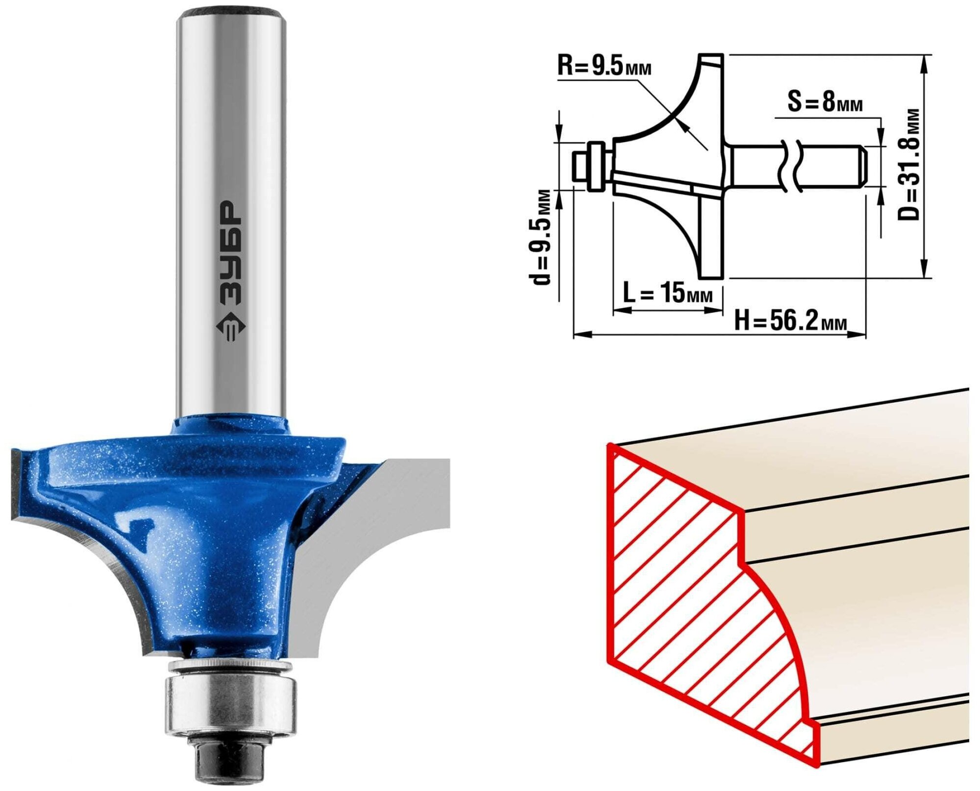 Фреза кромочная калевочная №1, D= 31,8мм, рабочая длина-15мм, радиус-9,5мм, хв.-8мм, d-9,5мм, ЗУБР Профессионал