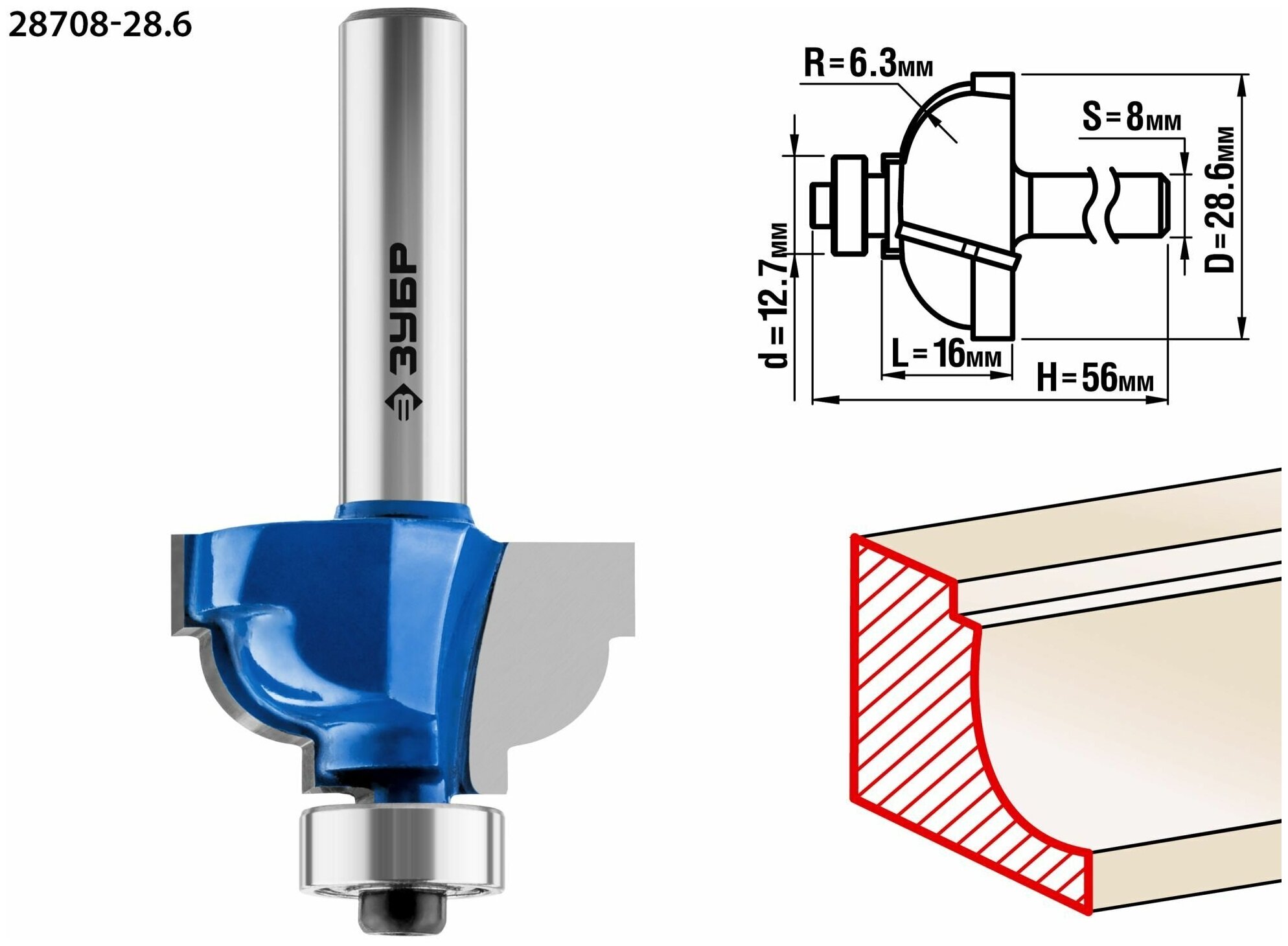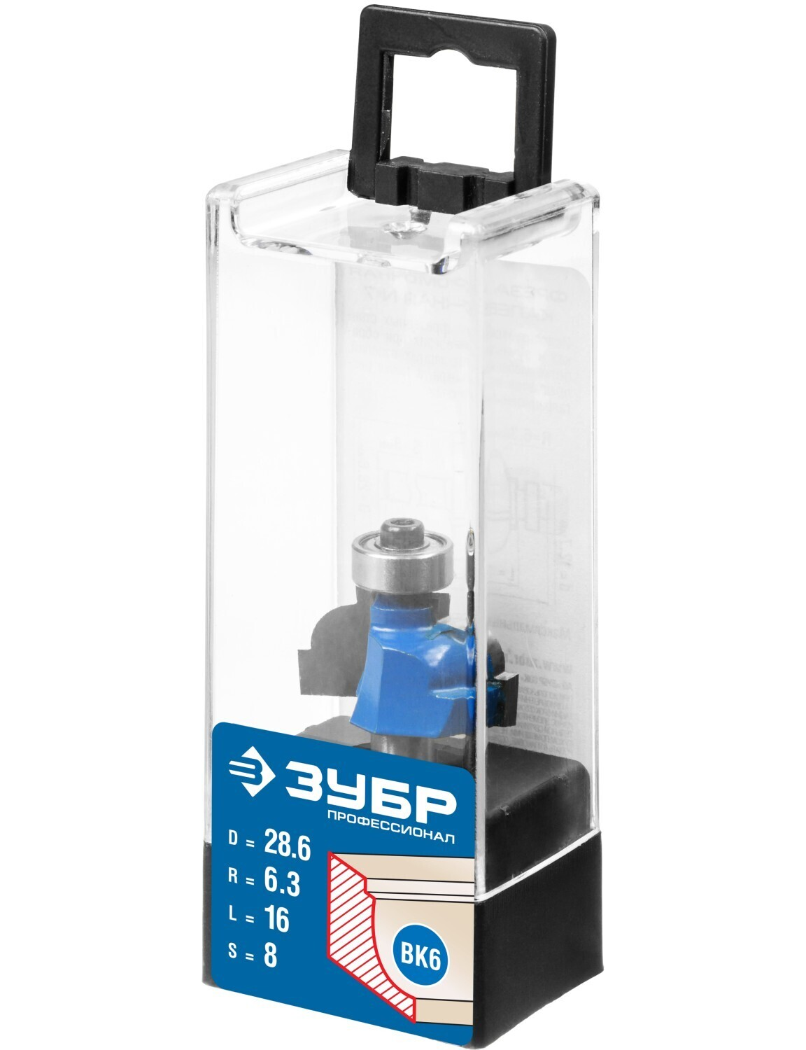 Фреза кромочная калевочная №7, D= 28,6мм, рабочая длина-16мм, радиус-6,3мм, хв.-8мм, d-12,7мм, ЗУБР Профессионал