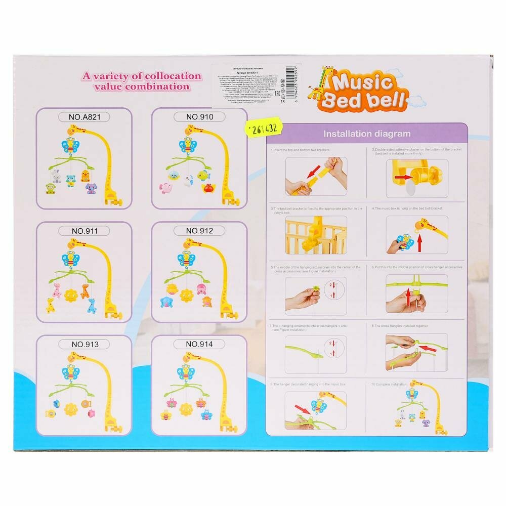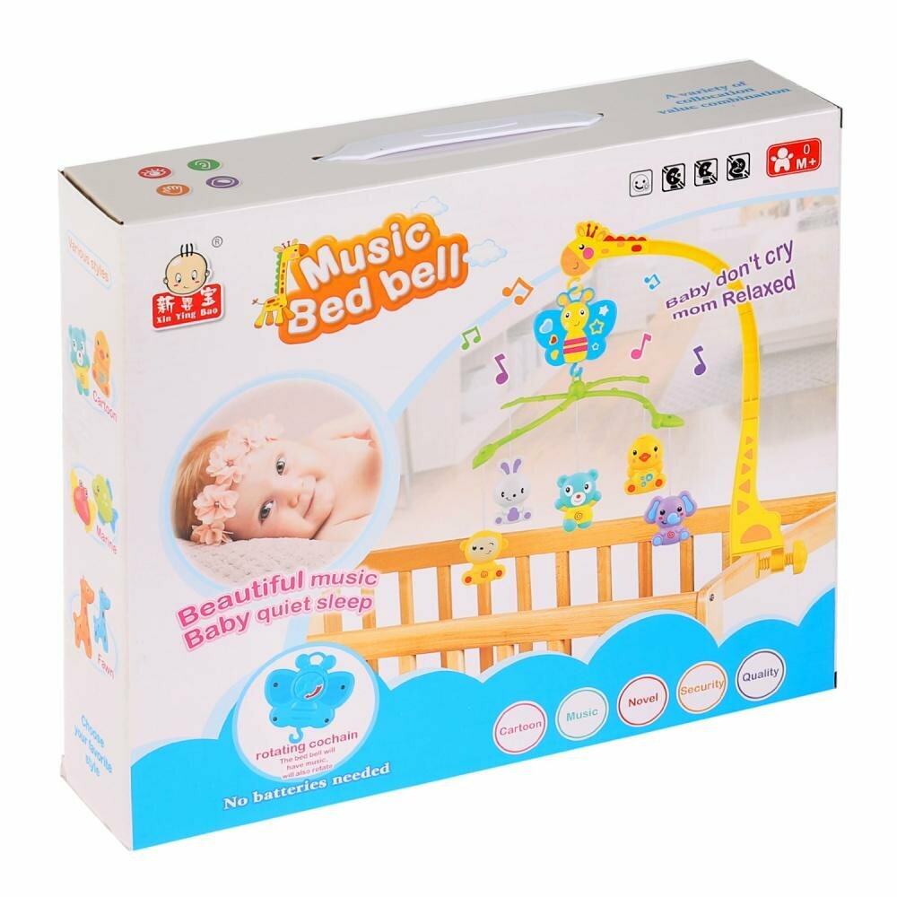 Музыкальная погремушка с милыми игрушками на подвеске станет любимой забавой малюток с рождения. Мобиль надёжно крепится на кроватку, люльку или коляску. Его центральная часть выполнена в виде цветной бабочки на лепестках, к которым крепятся верёвочки с яркими фигурами зверей. Всю композицию дополняет сказочный жираф, который является креплением и держателем подвижной части погремушки. Игрушка легко вращается и издаёт мелодичную приятную музыку. Погремушки помогают развивать у малышей мелкую моторику рук, хватательные рефлексы, цветовое восприятие, слух, внимание, тактильное восприятие и навыки удерживания предмета в поле зрения. Развивайте малыша с нашими мобилями! Работает от 3 батареек типа АА (не входят в комплект).Материал:пластмасса.Размер: 7 x 32 x 27 см.Рекомендовано детям с 3-х месяцев.