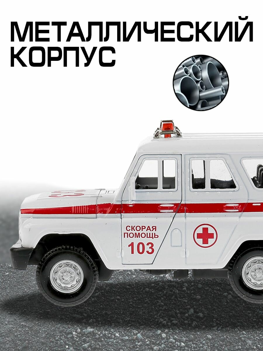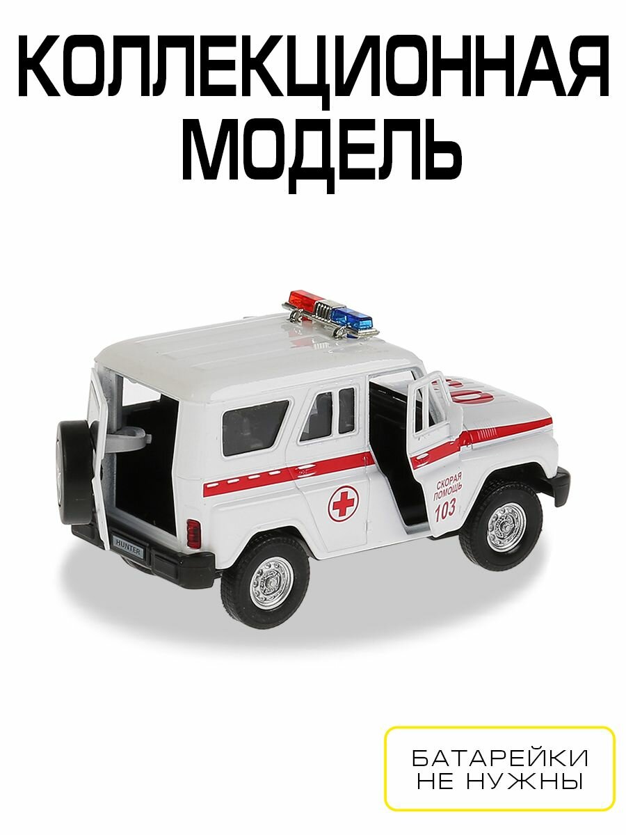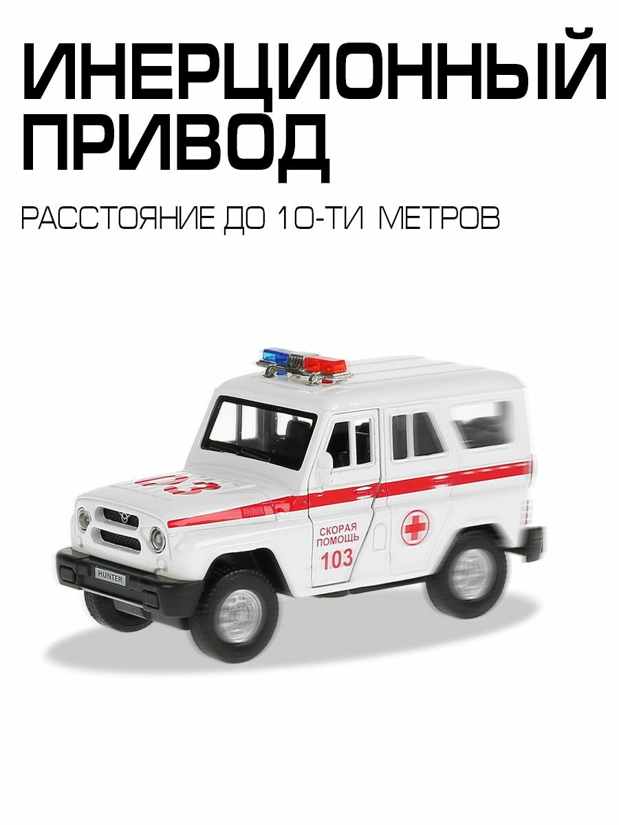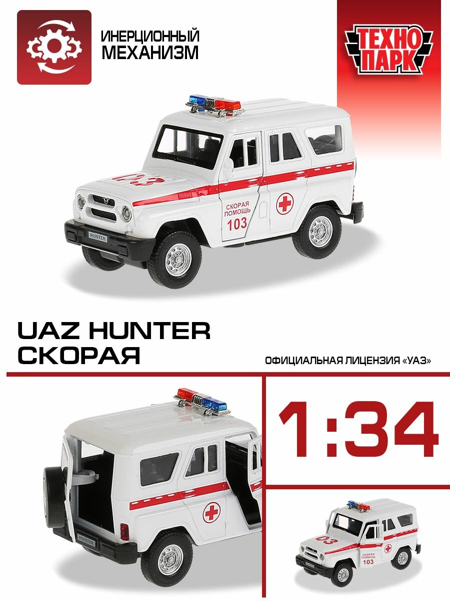 Металлическая модель выполнена реалистичной миниатюрной копией автомобиля марки Uaz Hunter в дизайне «Скорая помощь».- Игрушка изготовлена с высоким уровнем детализации, чем непременно заинтересует ребенка, позволяя рассмотреть все отличительные особенности специализированного транспорта медицинской службы.- У автомобиля белая кабина с красными полосками по бокам и специализированными надписями, на крыше установлены маячки.- Сквозь прозрачные окна и открывающиеся двери можно рассмотреть, как воссоздан салон автомобиля, также можно заглянуть в салон через заднюю дверь, на которой зафиксирована запаска.- Колесная база оснащена инерционным механизмом, что позволяет придавать ей ускорение, слегка потянув машинку назад, а затем отпустив.- Более реалистичной игру сделают звуковое сопровождение и световые эффекты модели.- Игрушка имеет компактные размеры, благодаря чему ребенок сможет взять ее с собой в детский сад или на прогулку.- В процессе сюжетно-ролевой игры ребенок примерит новые социальные роли, раскроет свое воображение и фантазию, потренирует координацию и мелкую моторику.- Машинке не страшны игровые столкновения, она выполнена из металла, некоторые детали изготовлены из ударопрочного пластика.