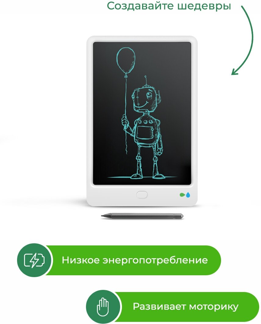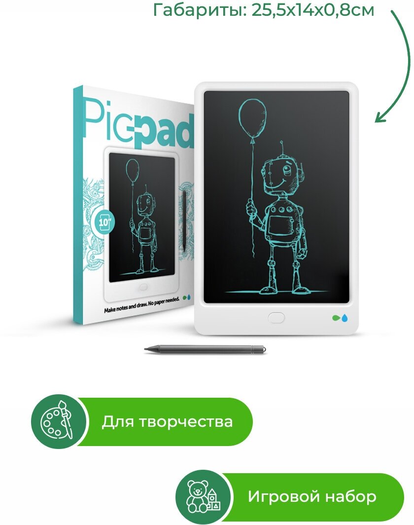 Назад к Истокам Планшет для рисования Pic-Pad с ЖК экраном - предназначен для рисования и создания заметок. Больше не нужна ручка, мел или маркер, бумага или доска. Поможет занять ребёнка в машине и очереди, сделать с ним домашнее задание, порисовать или поиграть в крестики - нолики. А с двумя такими устройствами можно даже сразиться в морской бой! Взрослые тоже оценят простоту планшета – будут делать записи во время работы, чертить схемы или составлять список дел на сегодня. В основе экрана лежит жидкокристаллическая технология, и изображение будет оставаться на планшете столько, сколько потребуется. А чтобы всё стереть – надо лишь нажать на кнопку, и поверхность в одно мгновение станет кристально чистой. Пишите записки, используйте как черновик, рисуйте с ребенком, делайте пометки – планшет пригодится и взрослым. Его не надо заряжать, он очень легкий, прочный и простой в использовании. Пиши и стирай! Особенности: Датчик давления нажатия на экран стилусом для нанесения линий разной толщины Функция блокировки экрана против случайных стираний Экстремально низкое потребление заряда. Одной батарейки хватит на сотни циклов использования. Батарейка CR2025 уже в комплекте. Размер дисплея - 10 дюймов Ручка – стилус в комплекте Планшет для рисования на котором не нужны ни краски, ни вода. Pic - Pad оснащен сенсорным ЖК - экраном с датчиком нажатия и комплектуется стилусом. Датчик нажатия позволяет регулировать толщину линий, а стереть рисунок можно одним нажатием кнопки. Pic- Pad станет отличный решением для юных художников, творческое пространство которых не ограничивается рабочим столом: компактный планшет можно взять с собой на прогулку, в гости или отправляясь в поездку на автомобиле. Планшет Pic-Pad выполнен в пластиковом корпусе белого цвета. На его передней стороне расположен сенсорный ЖК - экран, под ним круглая кнопка стирания рисунка, с ее же помощью можно блокировать экран. Экран достаточно жесткий и прочный, благодаря чему во время рисования создается ощущение, словно водишь карандашом по бумаге. Планшет весит всего 192 г и имеет размер чуть меньше альбомного листа: 16.6 х 25.5 х 0.9 см. Это позволяет брать его с собой в поездку, положив в папку или сумку. Pic - Pad комплектуется миниатюрным стилусом темно - серого цвета. Для рисования на Pic - Pad не требуется ни компьютера, ни смартфона, ни даже зарядного устройства. Батарейка CR2025 уже в комплекте, поэтому достаточно просто установить ее, включить планшет и начать рисовать. Экран оснащен датчиком нажатия, благодаря чему ребенок может выбирать толщину линий. В меню можно выбрать цвет, а также инструмент, в том числе и ластик. Для того, чтобы не стереть рисунок случайно, в планшете предусмотрена функция блокировки экрана.