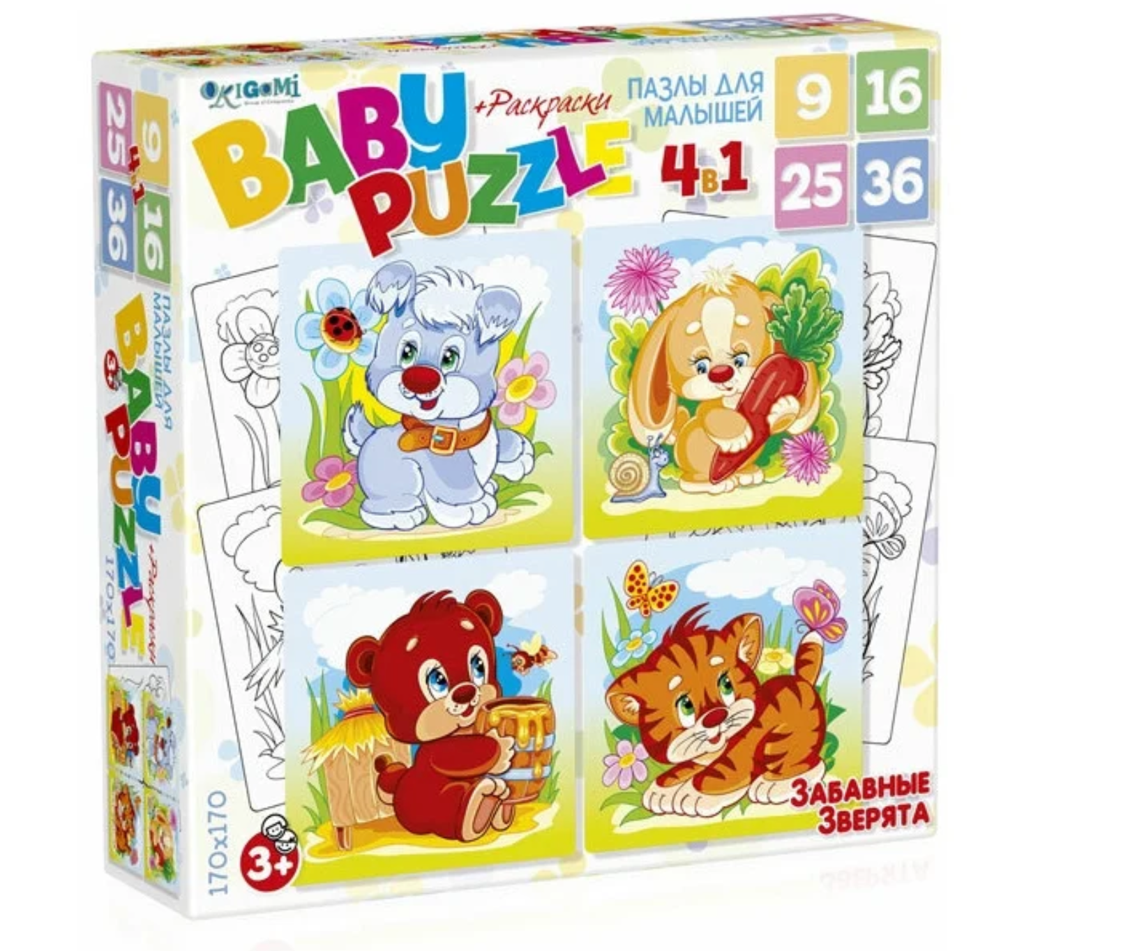 Пазл 4 в 1 (из 9, 16, 25, 36 деталей). Ребенок без труда соберет яркую картинку с милыми персонажами и, конечно же, получит массу положительных эмоций! Начав с самого простого — самого малого количества деталей, — ребенок легко перейдет к пазлам посложнее, а заодно потренирует усидчивость и внимание, разовьет мелкую моторику, координацию движений, воображение и фантазию.